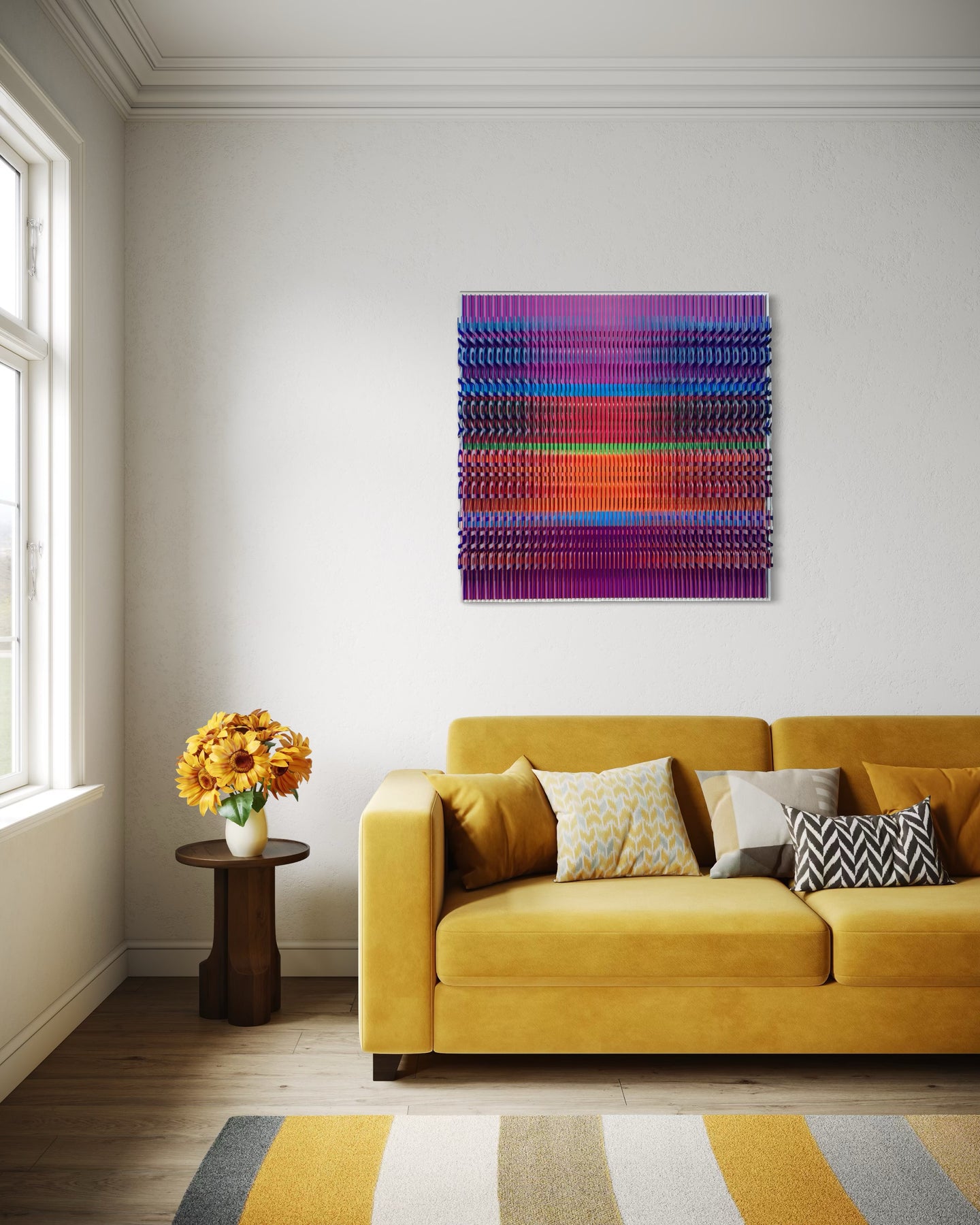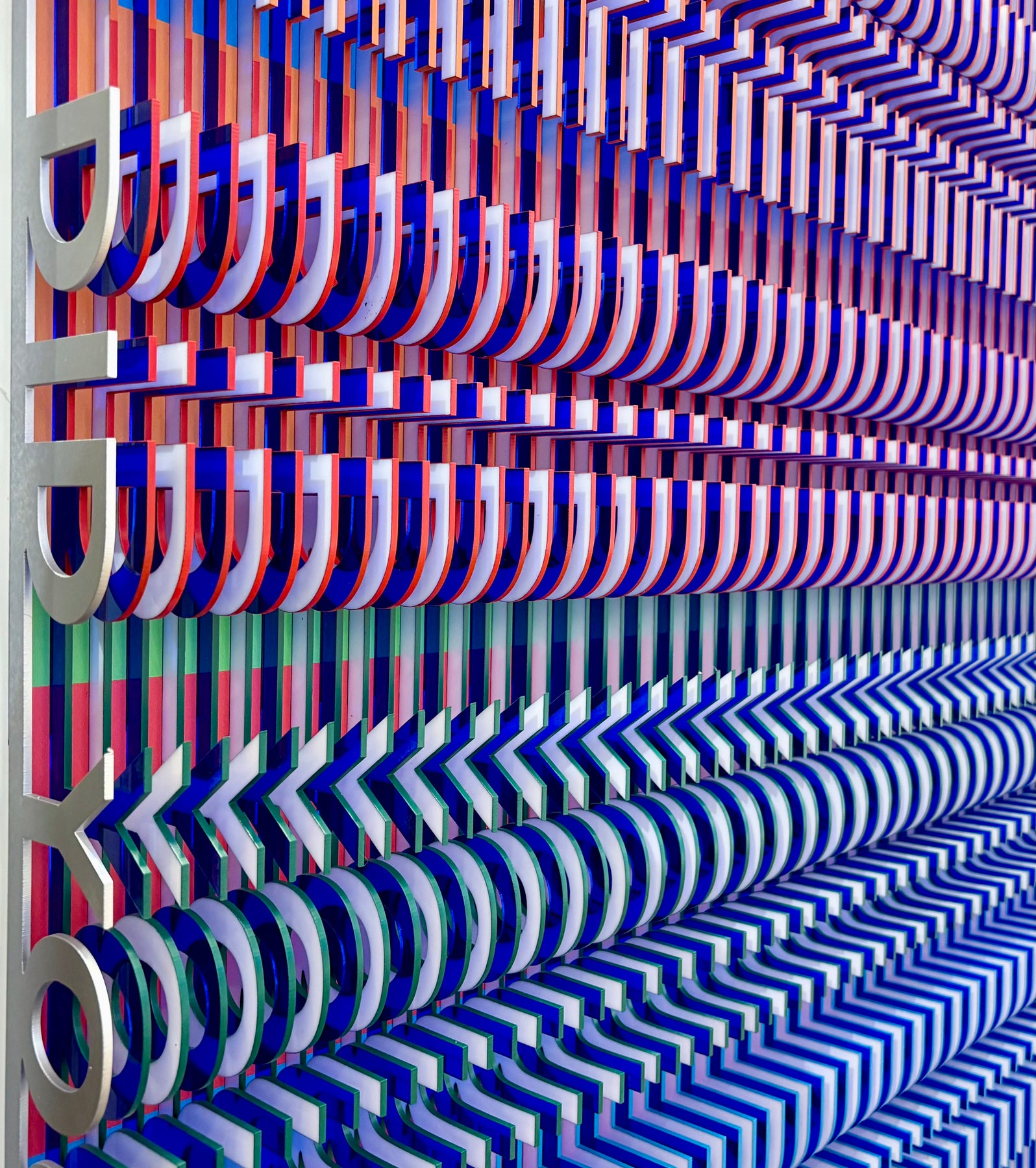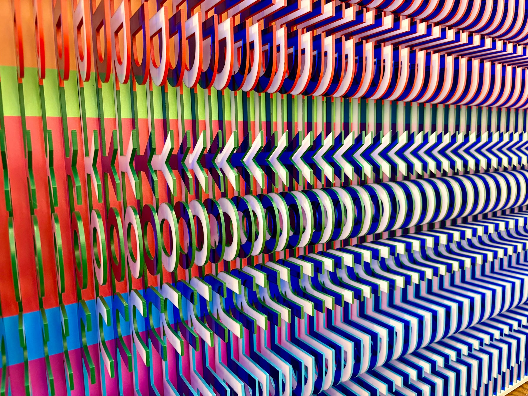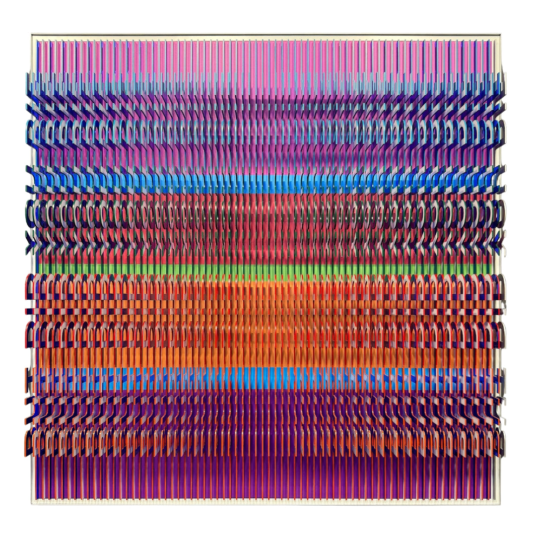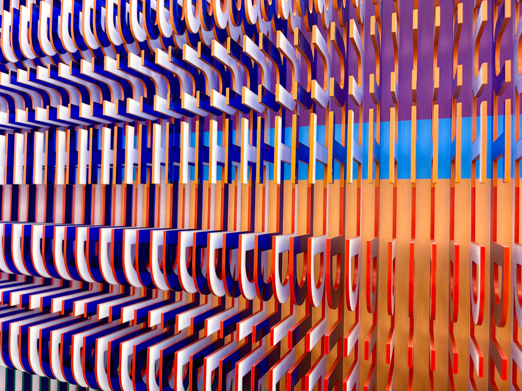 Margulis is drawn to scenes that allow him to explore composition in its most basic geometric forms: symmetry, asymmetry, volume, shapes, forms, limits, transitions and more. The challenge of creating balanced compositions in unexpected ways is fundamentally what attracts the artist’s eye and fuels his ideas.  The artist begins with 3D digital software from which he designs and maps his 3D objects and compositions, ultimately cutting them into layers from different types of plastic and aluminum composites. Most of Jose’s work uses acrylic sheets and aluminum composites in various colors, textures, and patterns, often inspired further by traditional Mexican arts.