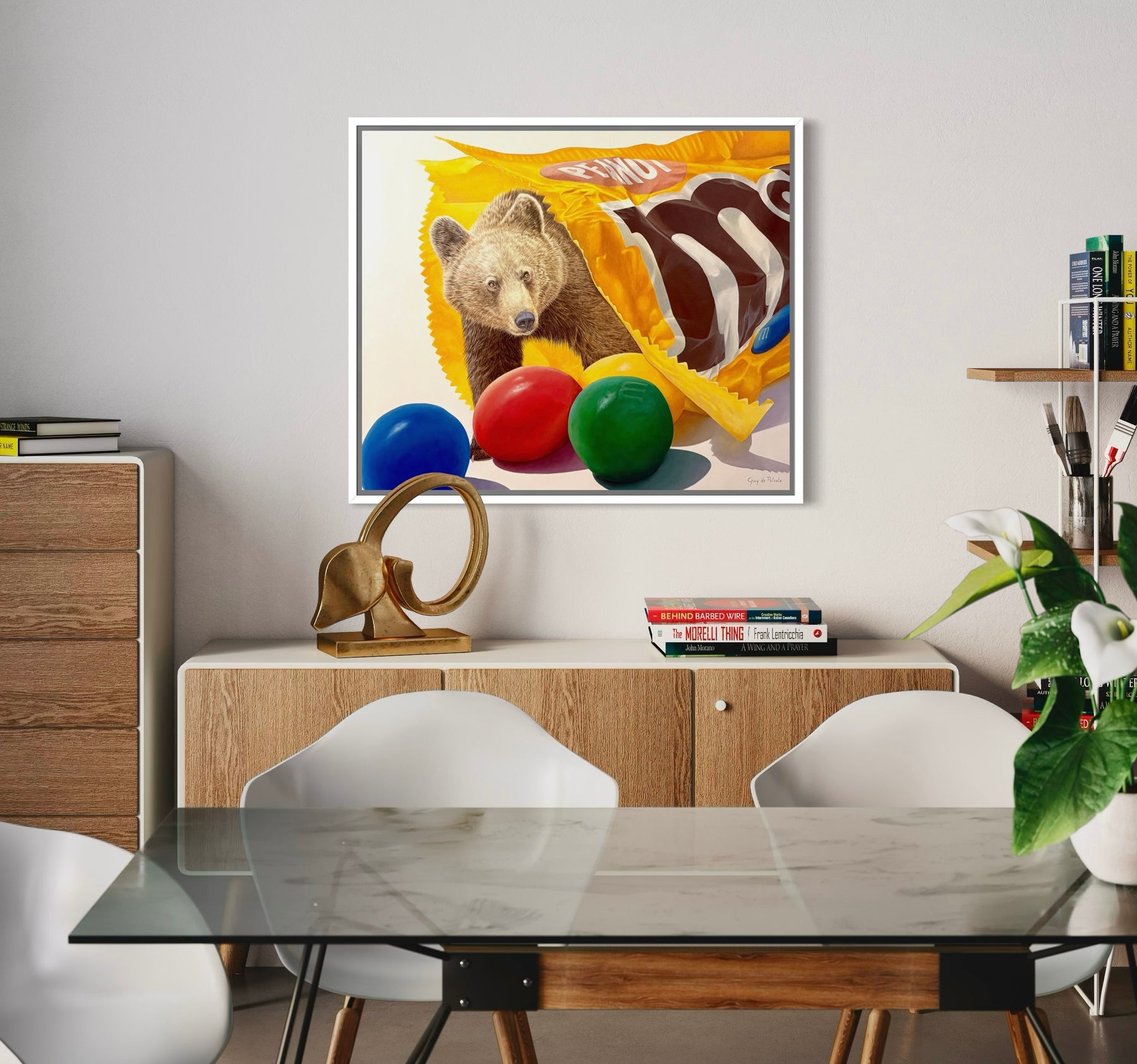 Guy de Potesta's surreal, dream-like canvases reveal the unsettling realities of a world undergoing rapid environmental degradation. Known for pairing wildlife with human-made objects in humorous, improbable ways, de Potesta uses absurdity not as escape but as a sharp lens on a natural world increasingly strained by human materialism.