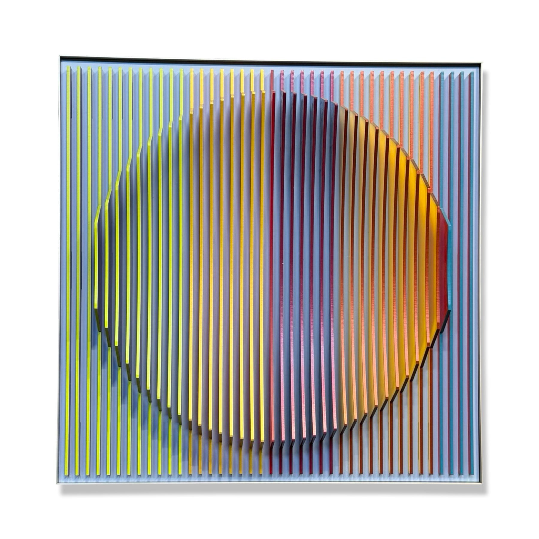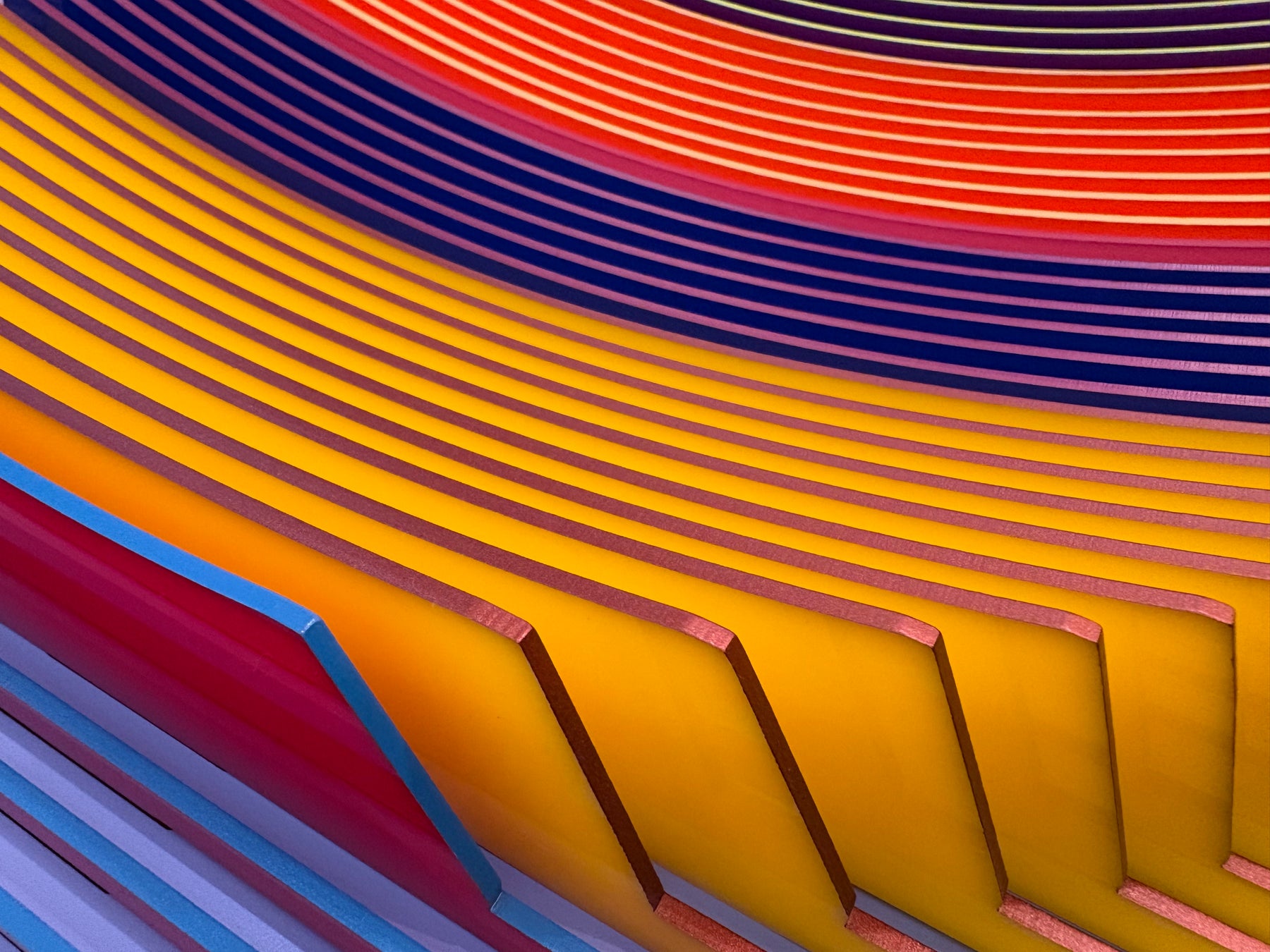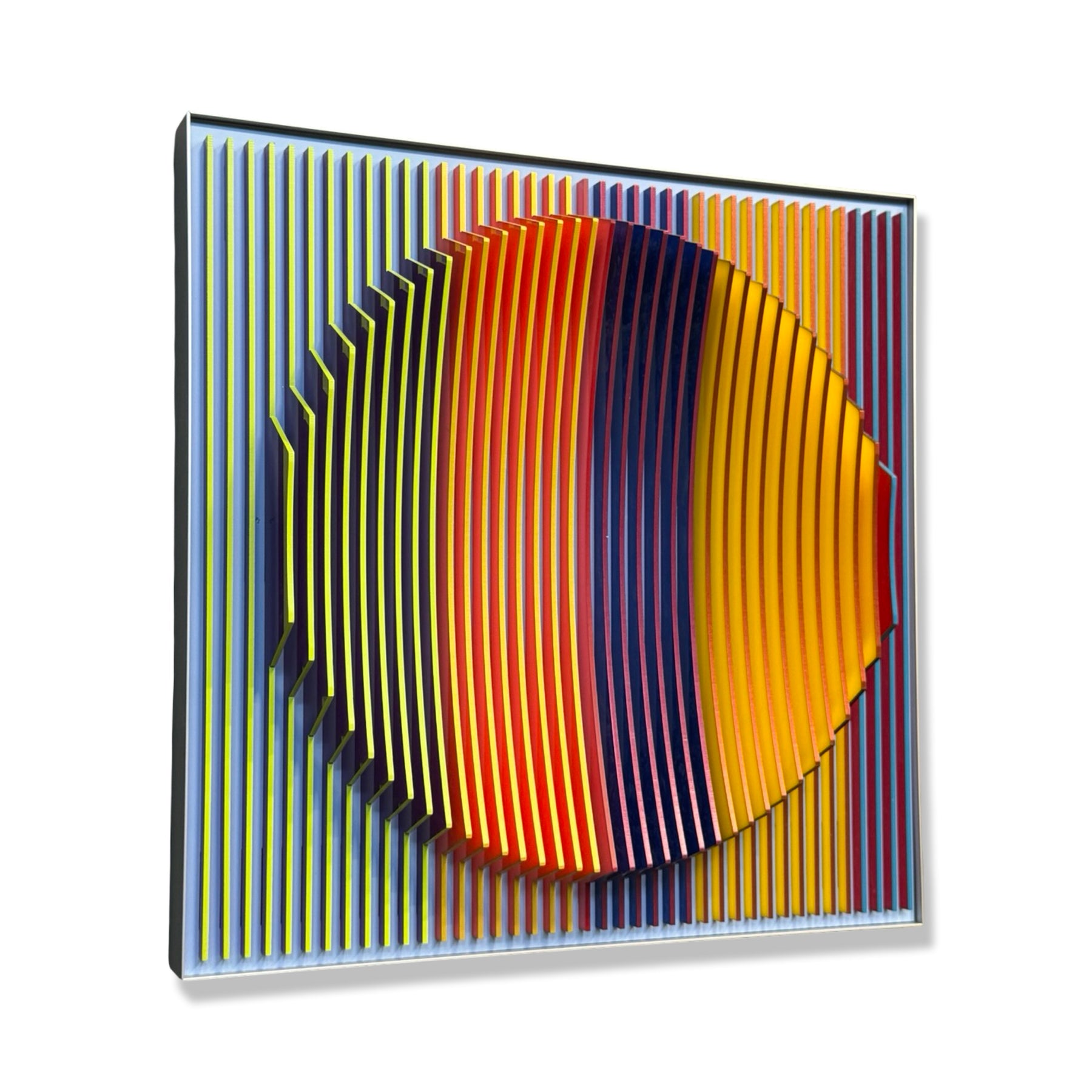 Margulis is drawn to scenes that allow him to explore composition in its most basic geometric forms: symmetry, asymmetry, volume, shapes, forms, limits, transitions and more. The challenge of creating balanced compositions in unexpected ways is fundamentally what attracts the artist’s eye and fuels his ideas. The artist begins with 3D digital software from which he designs and maps his 3D objects and compositions, ultimately cutting them into layers from different types of plastic and aluminum composites. Most of Jose’s work uses acrylic sheets and aluminum composites in various colors, textures, and patterns, often inspired further by traditional Mexican arts.