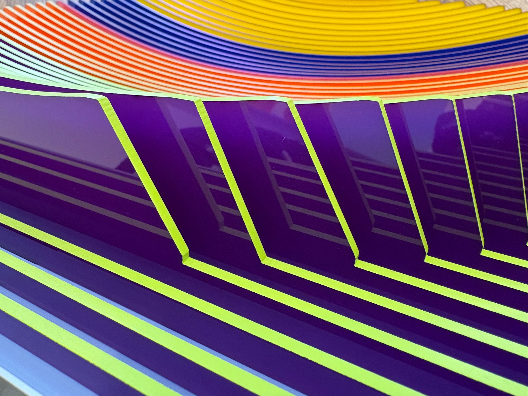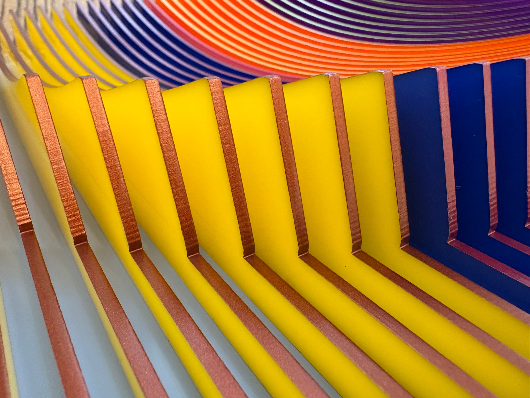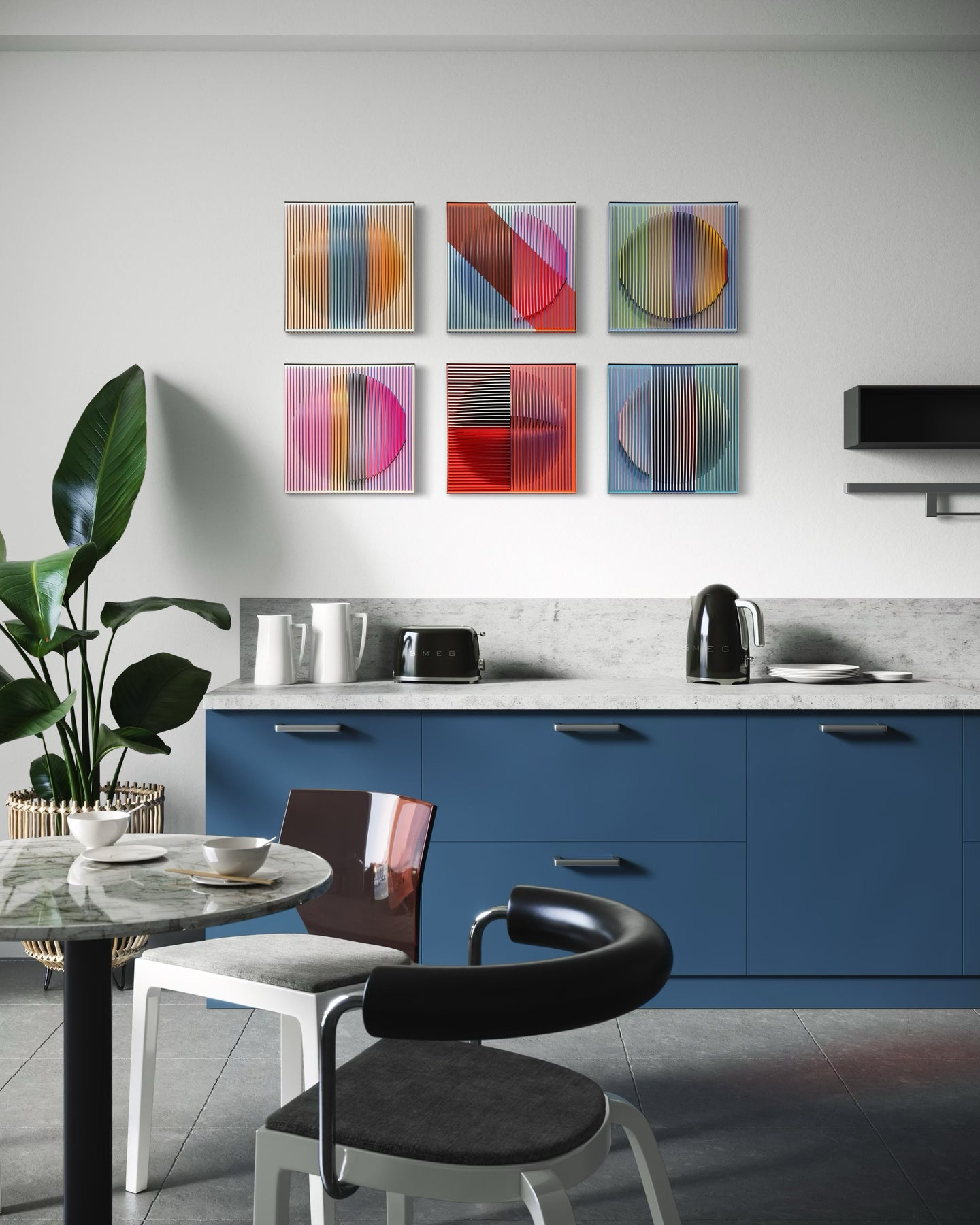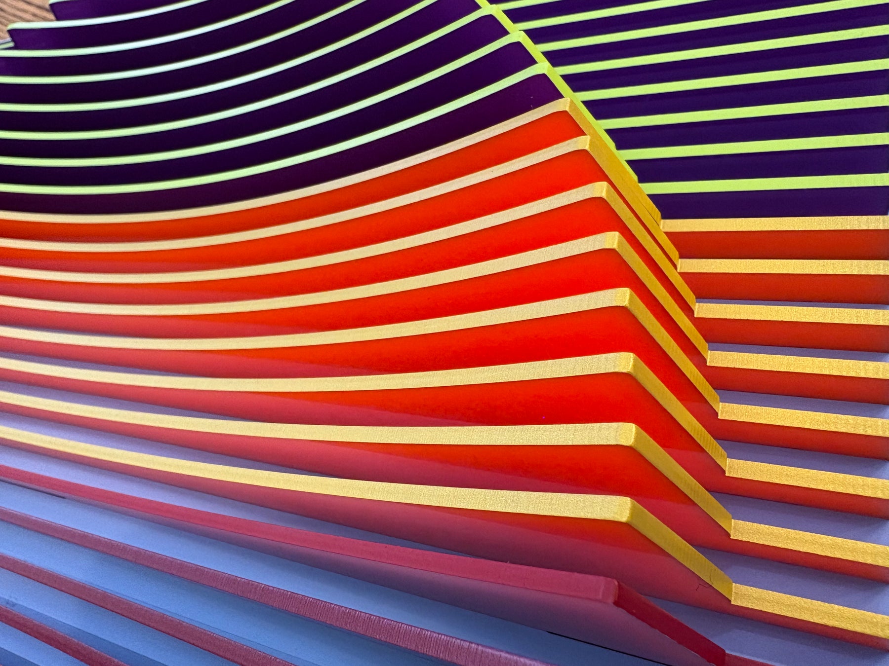 Margulis is drawn to scenes that allow him to explore composition in its most basic geometric forms: symmetry, asymmetry, volume, shapes, forms, limits, transitions and more. The challenge of creating balanced compositions in unexpected ways is fundamentally what attracts the artist’s eye and fuels his ideas. The artist begins with 3D digital software from which he designs and maps his 3D objects and compositions, ultimately cutting them into layers from different types of plastic and aluminum composites. Most of Jose’s work uses acrylic sheets and aluminum composites in various colors, textures, and patterns, often inspired further by traditional Mexican arts.