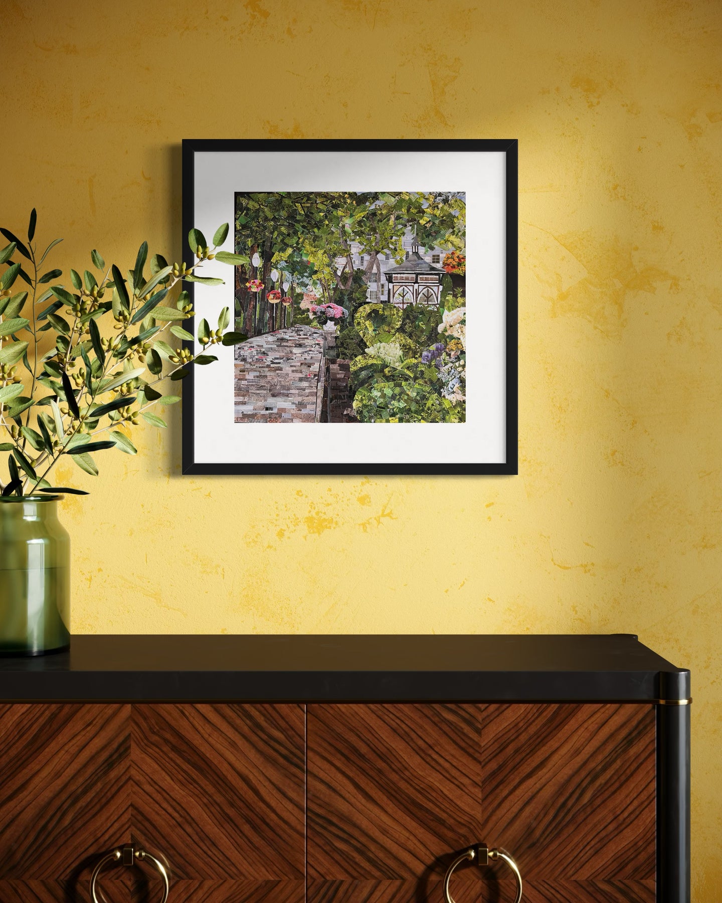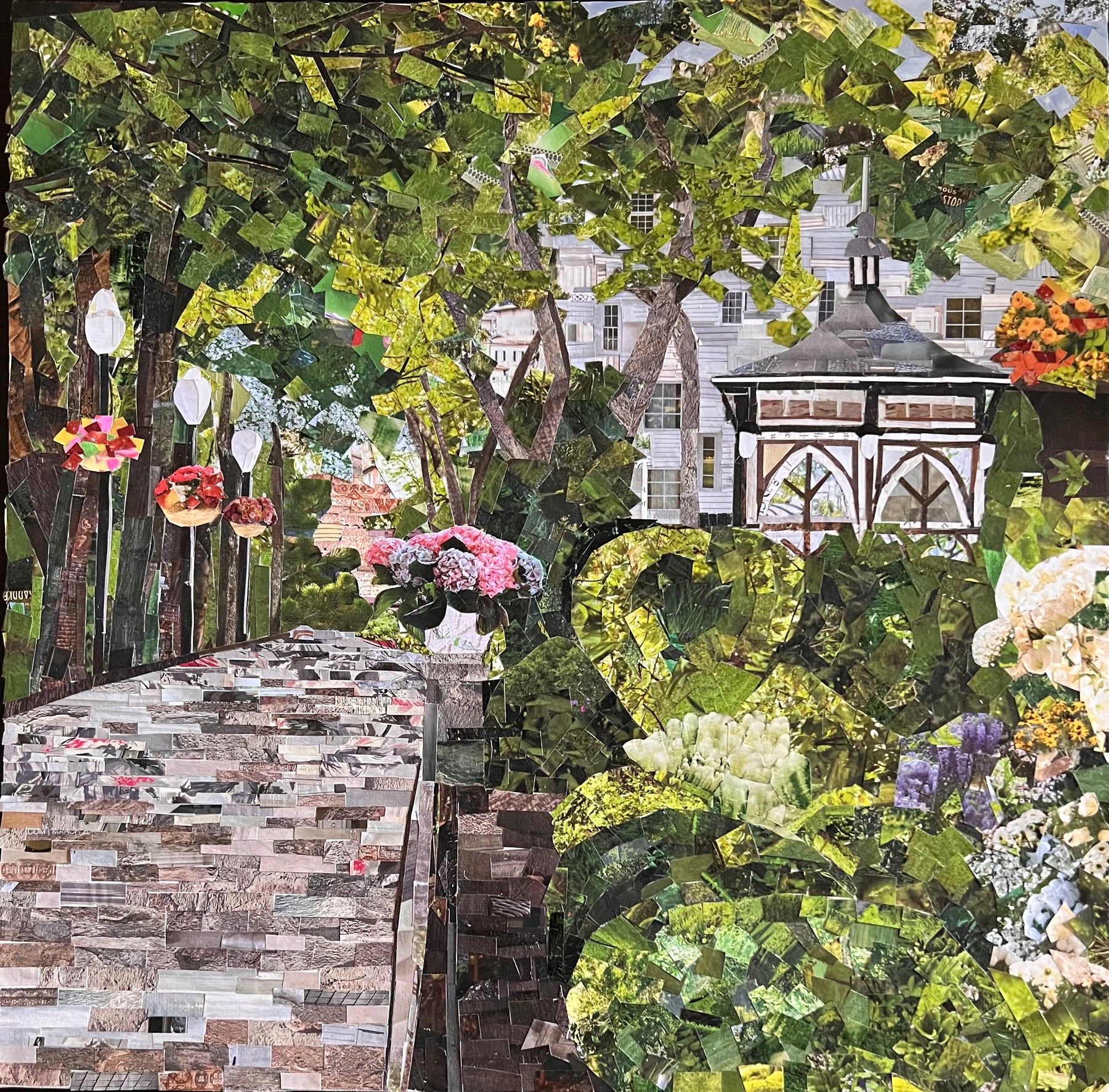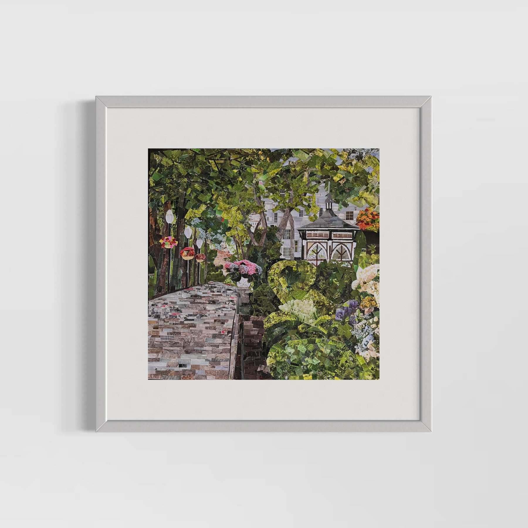 17" x 17" torn paper collage by Chrissy McIntyre. Artwork ofvibrant Rittenhouse Square Park in Philadelphia in the summertime, with greenery, a brick path and a gazebo.