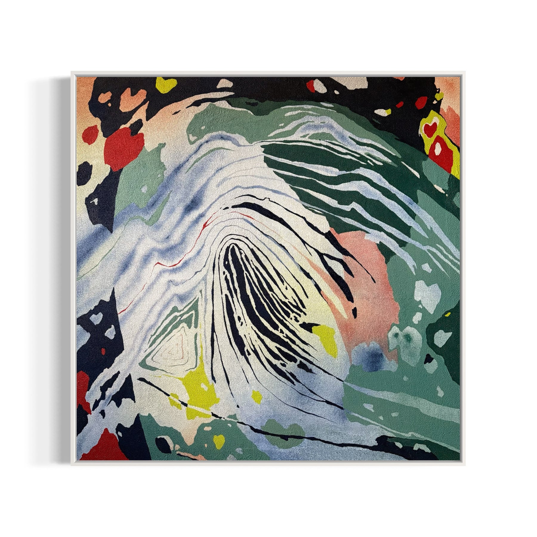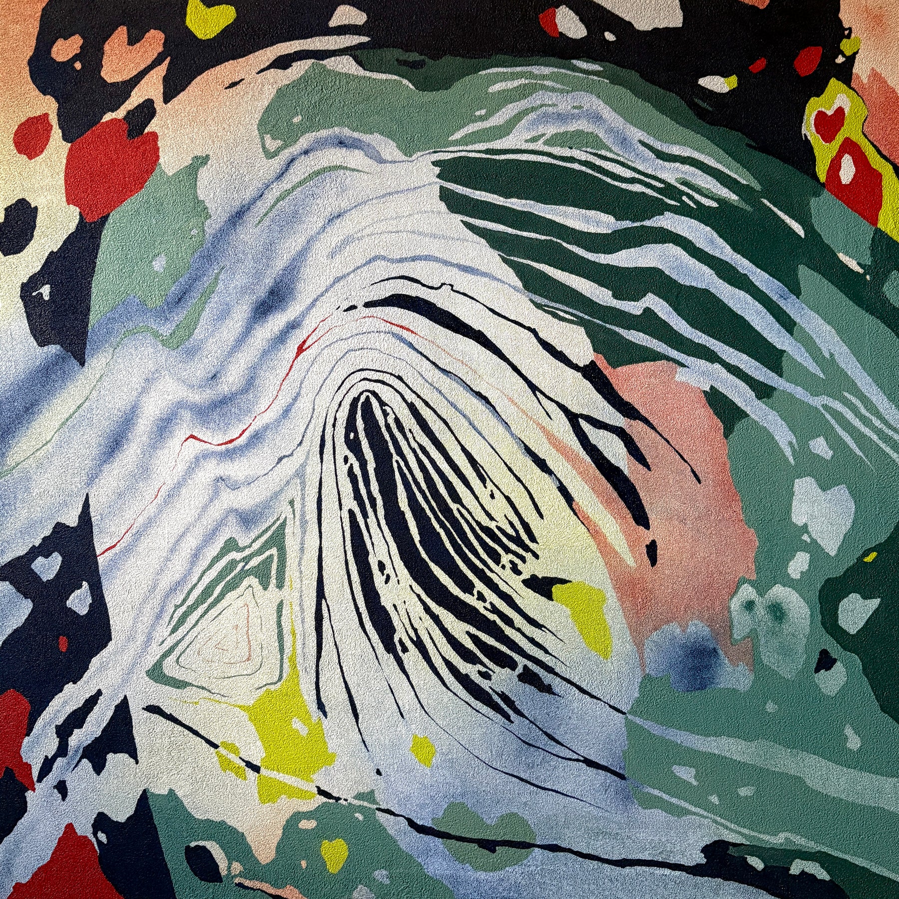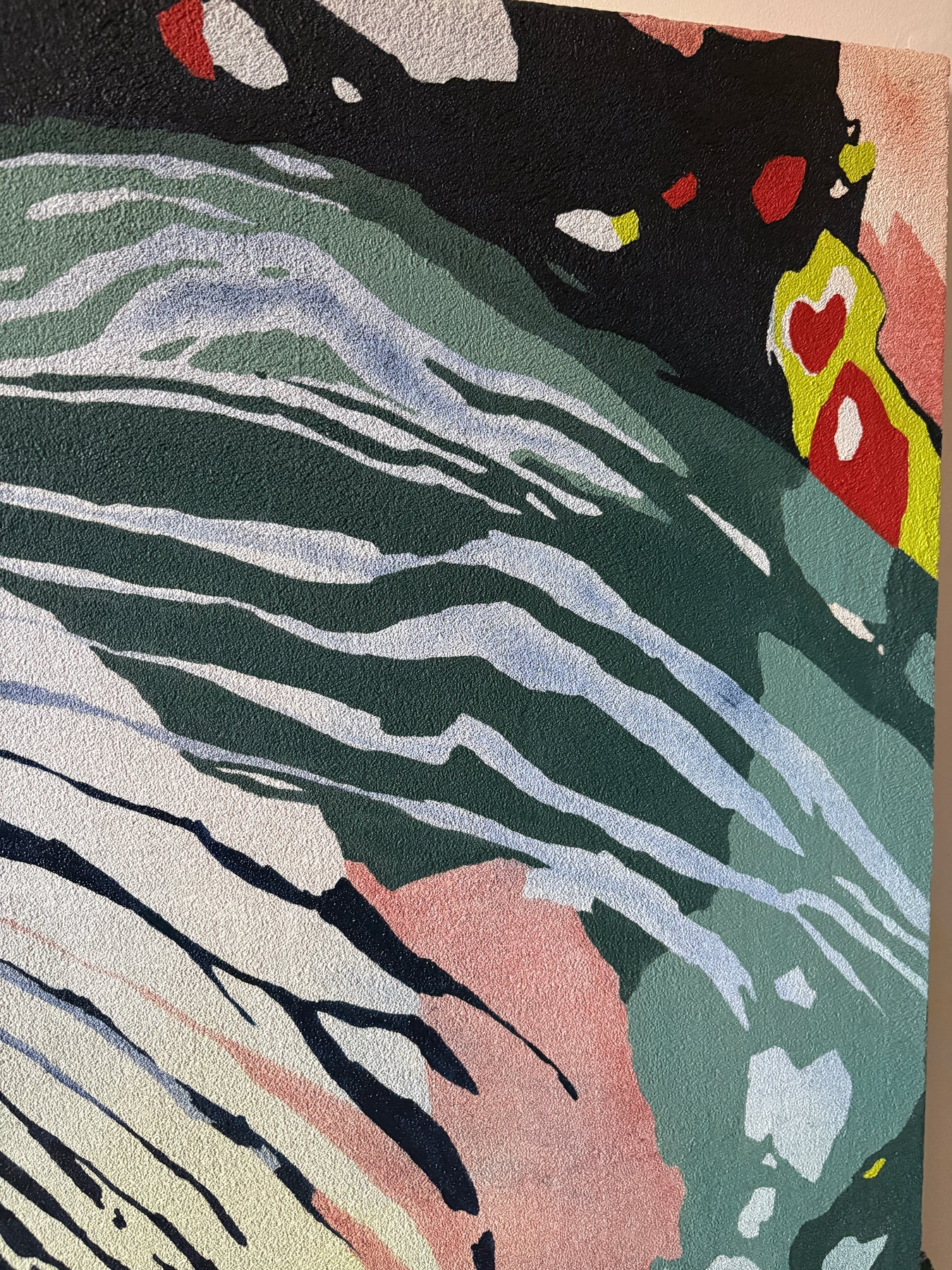 Erin Touey’s work straddles the line between abstraction and representation in her new series of pumice-primed canvas oil paintings. Touey utilizes fluid shapes, variation of line weight, non representational color, distortion of perspective, and in this series, the texture of the pumice primed canvas to bring her often tangible subject matter into the abstract realm. With a limited palette consisting only of Phthalo Blue, Cadmium Yellow, and Quinacridone Magenta, Touey challenges herself to mix all of her colors. The white of the canvas is preserved deliberately, the negative space making shapes that sometimes jump forward or fall back.