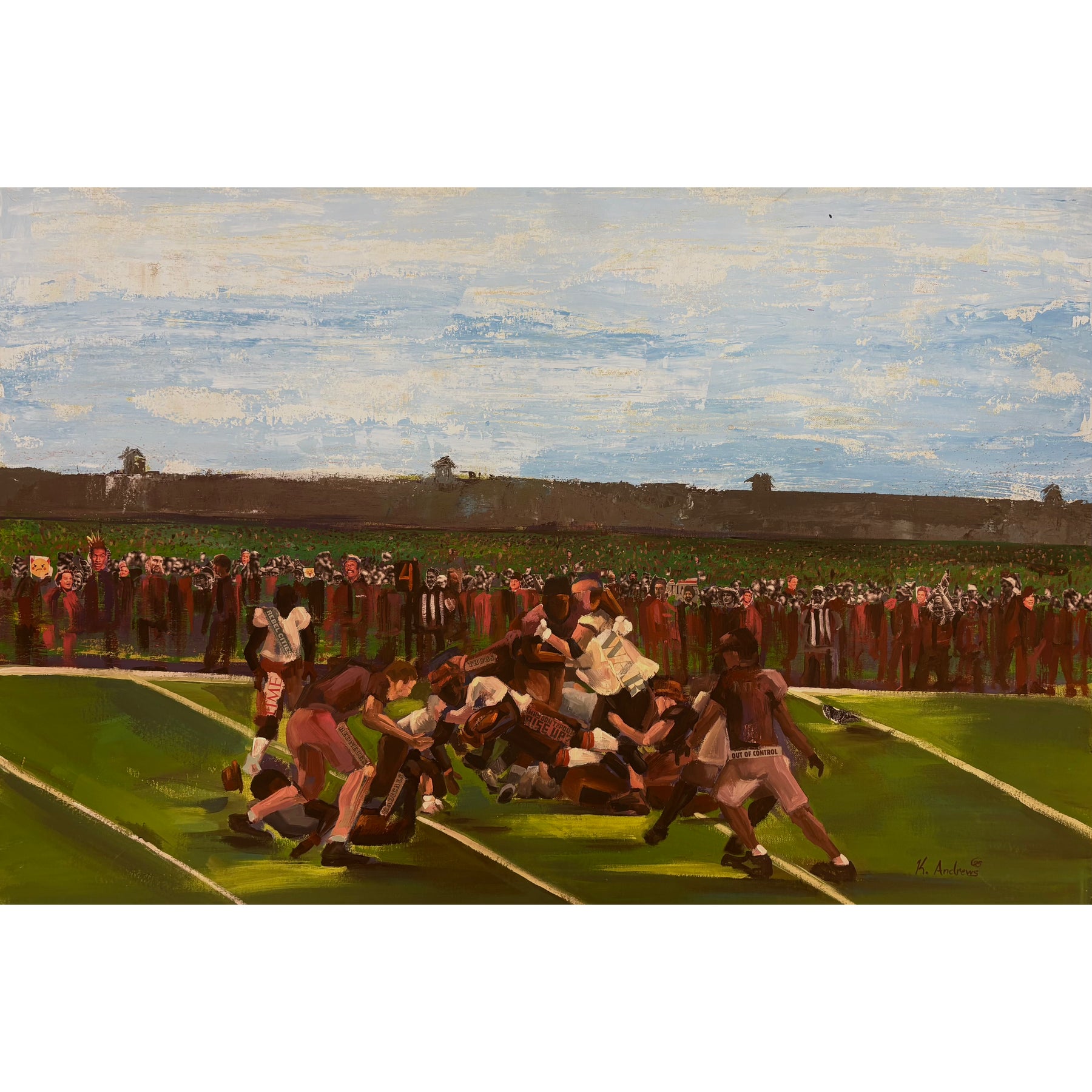 figures piled on football field and crowds standing by with blue sky and green grass tones of red and brown