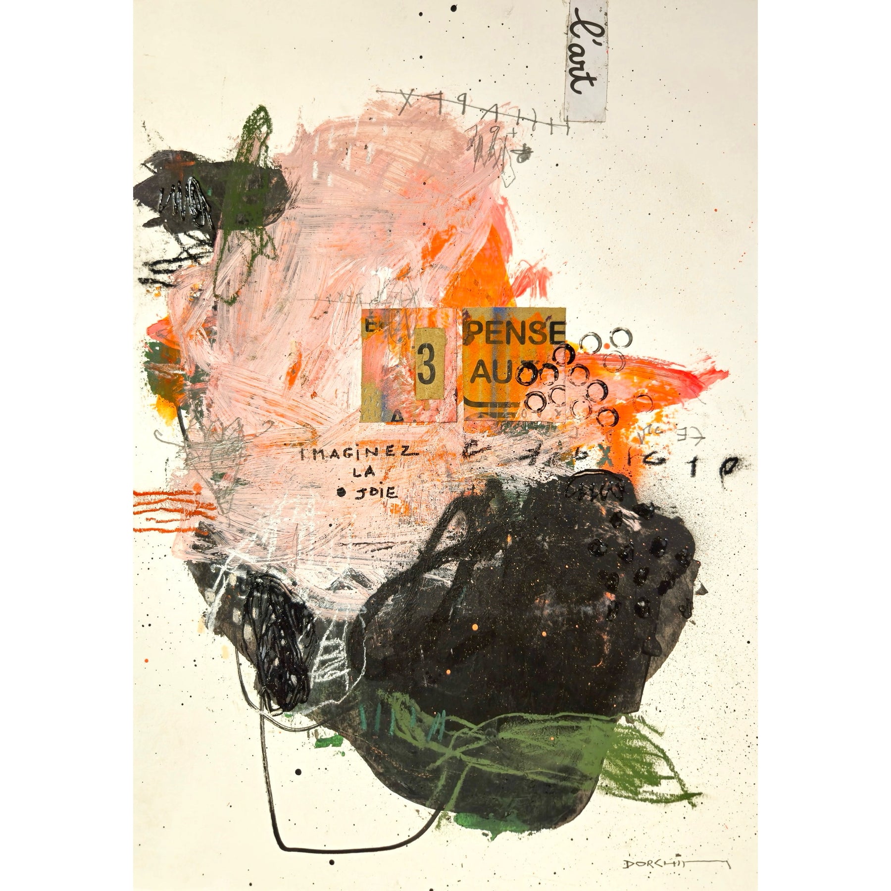 Abstract mixed media artwork on paper by Laurent Dorchin in black, pink, orange, green and white. Organic linework and minimal illustrations with collage and text elements.