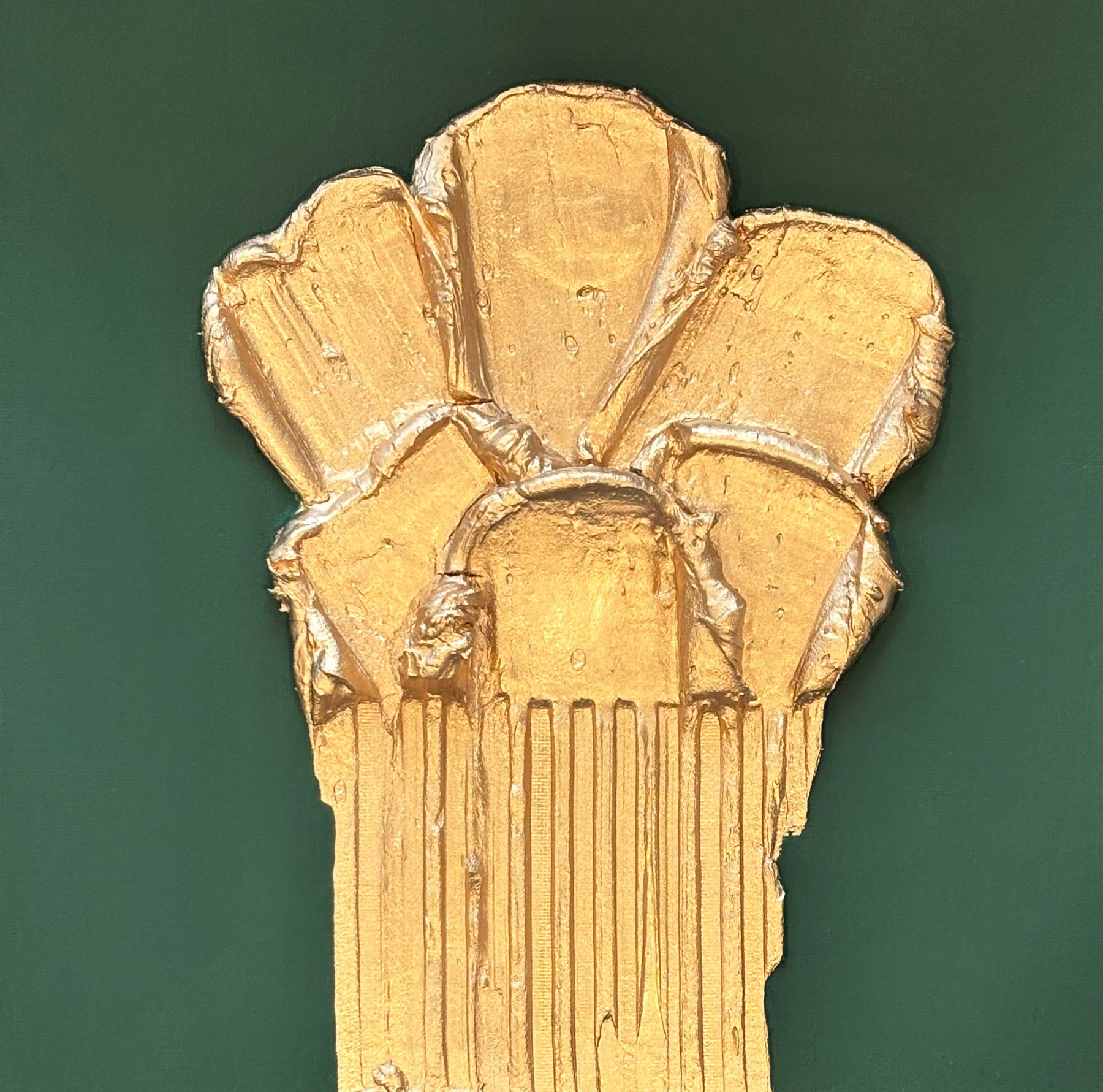 layered gold texture joint compound sculpted with lines running down on matte green dark forrest hunter background abstract minimal floral bouquet