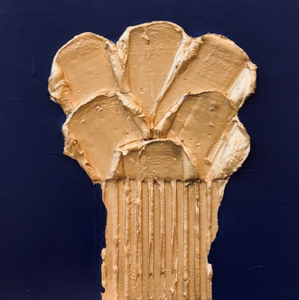 golden layered joint compound texture sculpted abstract floral bouquet on matte dark blue background
