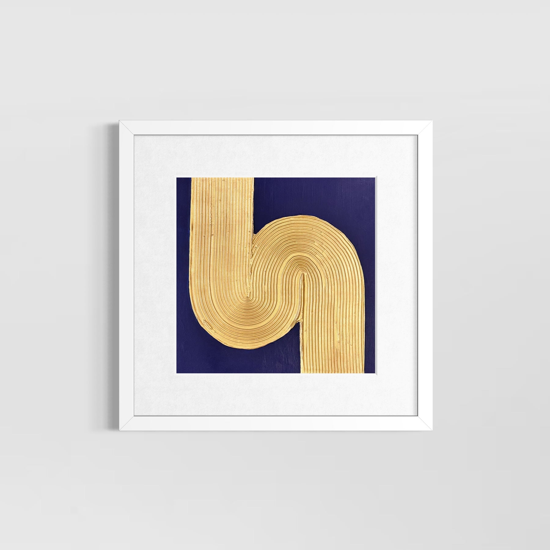 minimal geometric abstract organic shape in gold with lines curving and straight on blue background