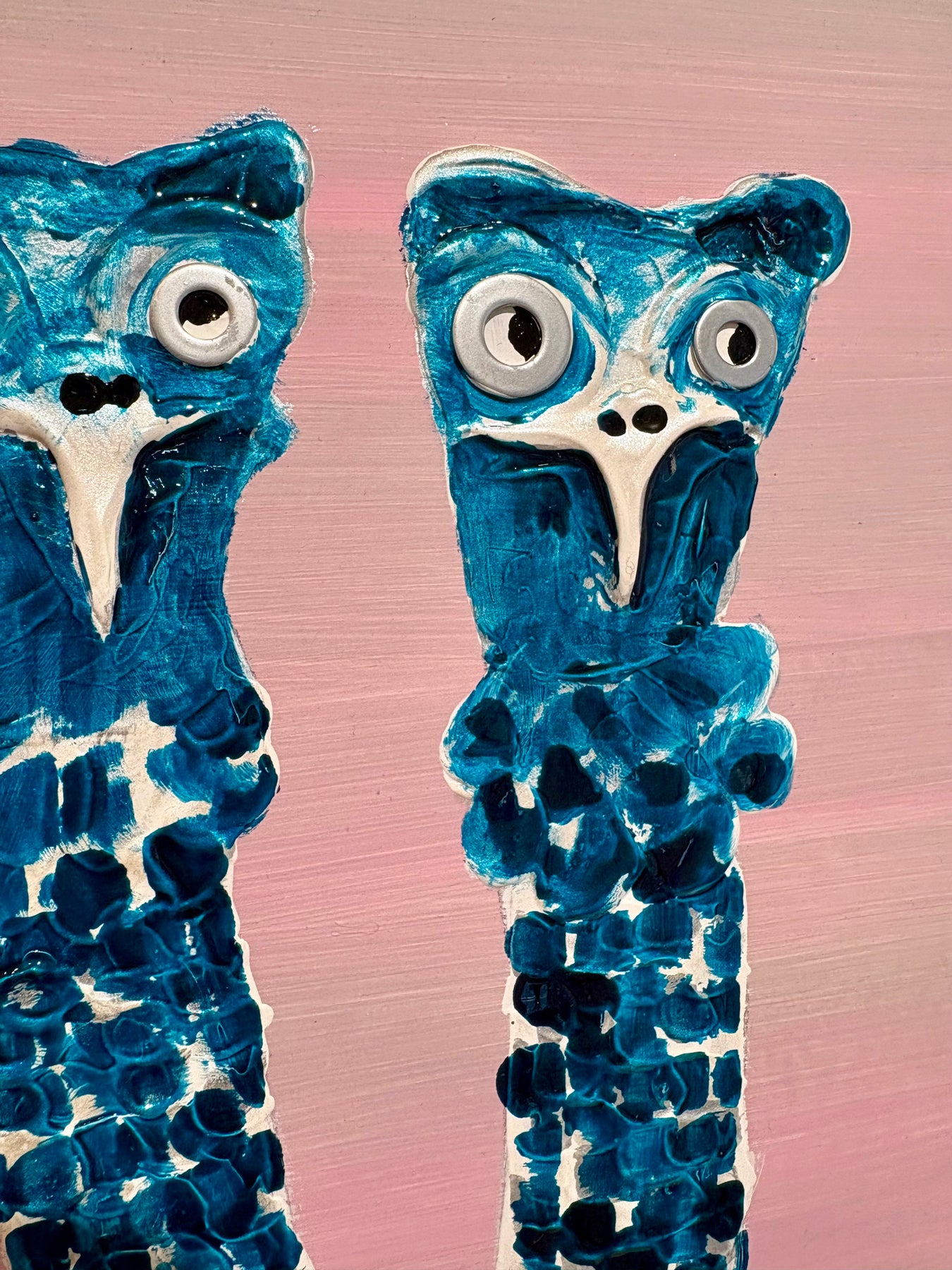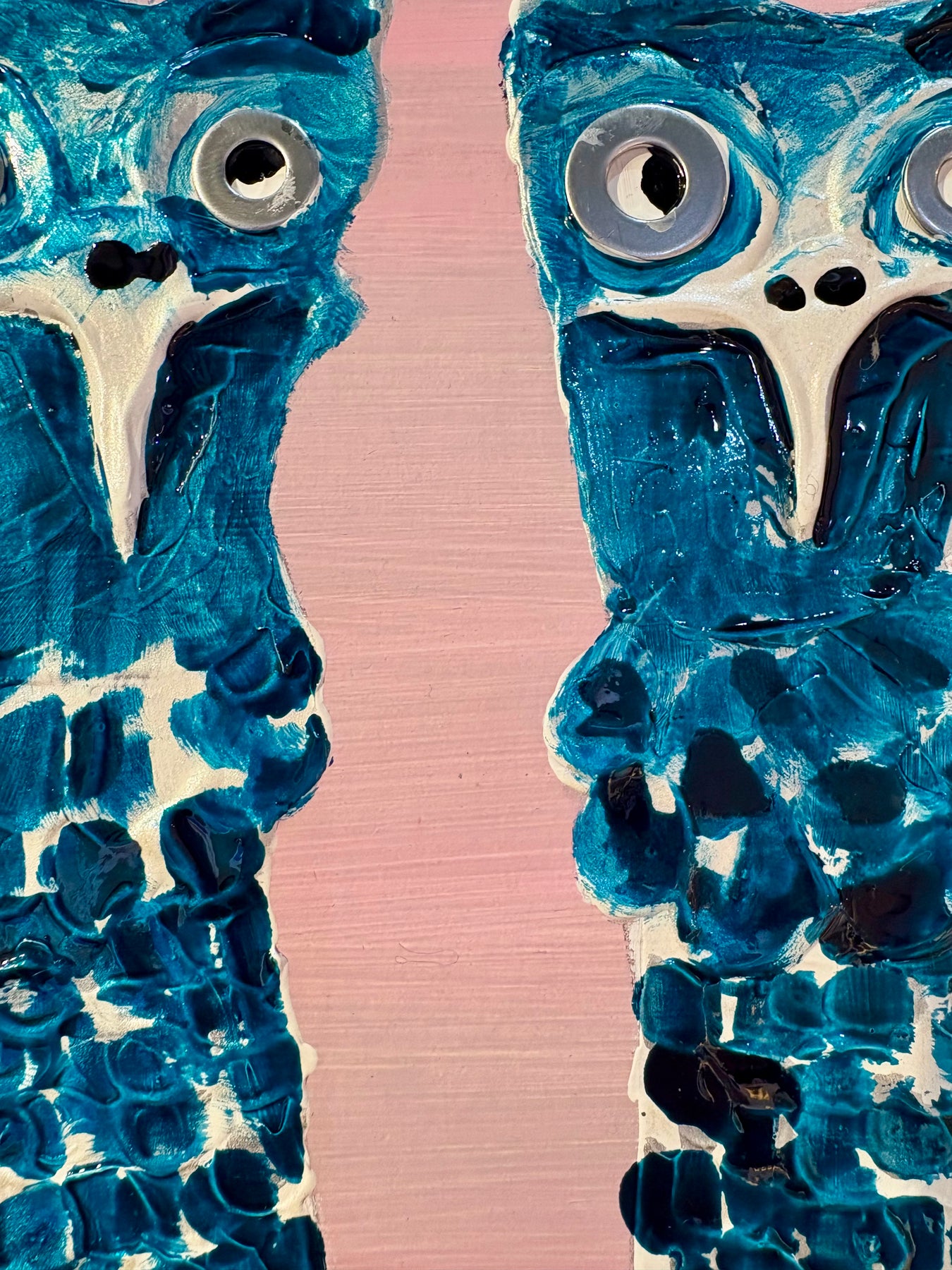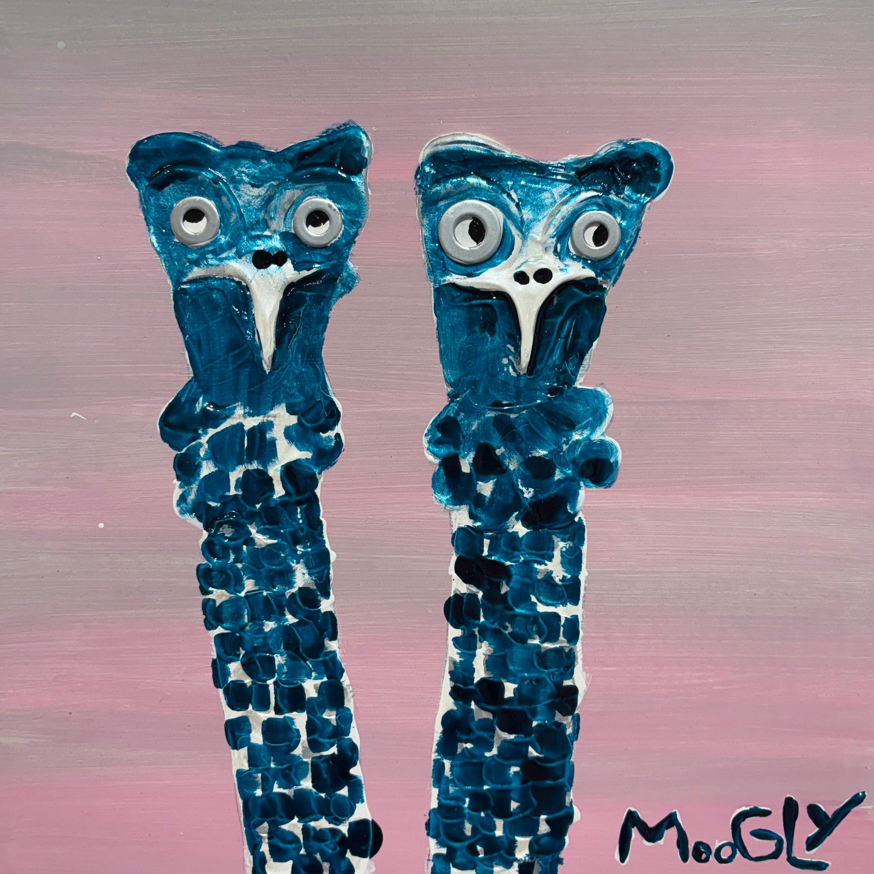 French graphic designer, illustrator, and painter Moogly creates semi-abstract "humanimal" portraits. His textured, splattered animals have oddly complex human expressions from bewilderment to apathy. Using acrylic, lacquer, and resin, he positions the monochromatic characters against a black void, allowing the eyes, marked by two machine washers, to speak. Moogly is deeply ashamed of the environmental harm caused by humans, so he allows animals to reflect this emotional damage back at us.