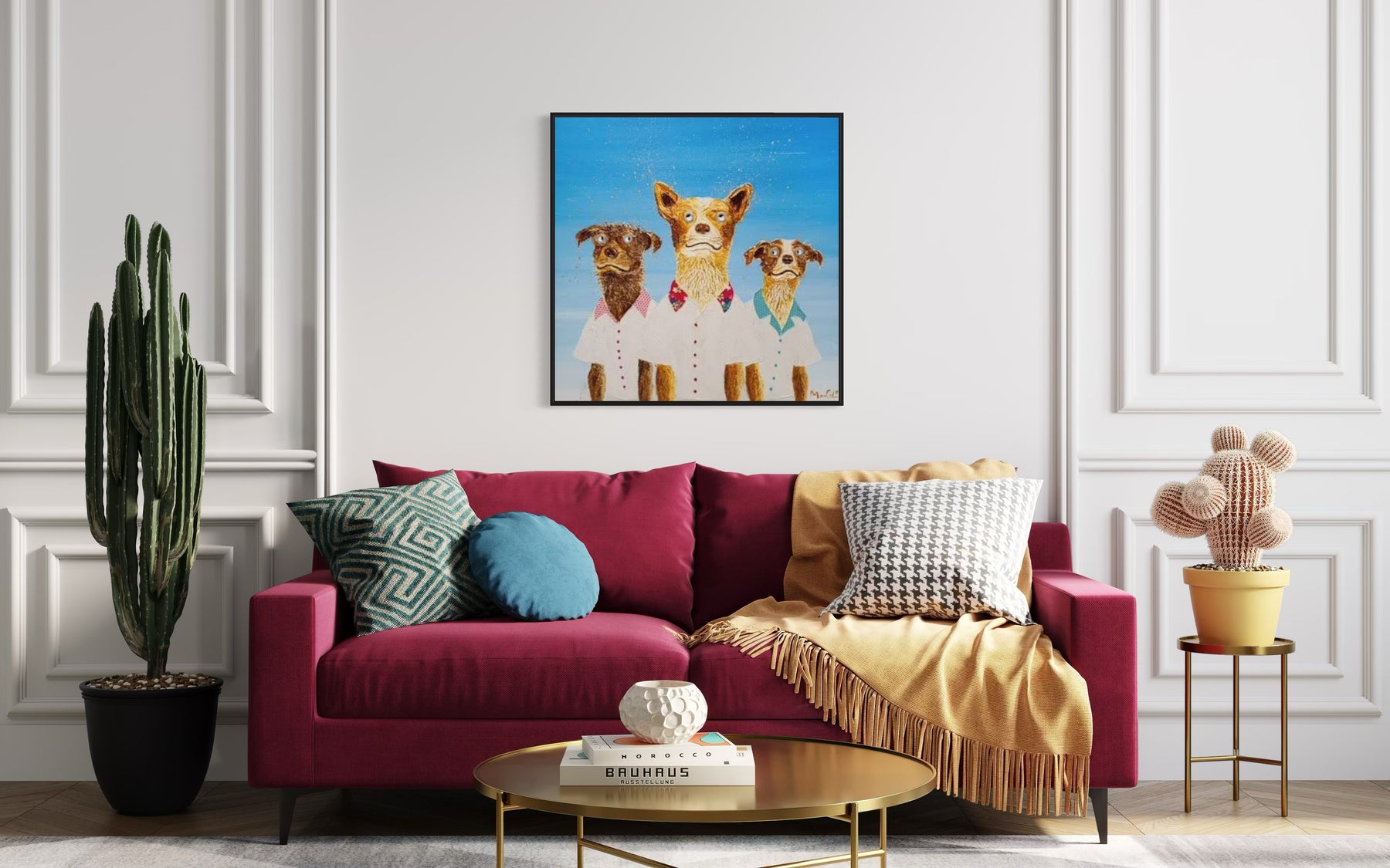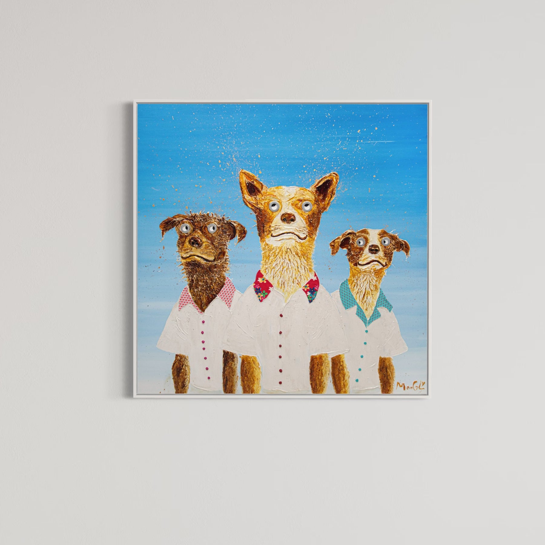 40" x 40" acrylic on canvas painting of three dogs in white shirts over a blue gradient background.