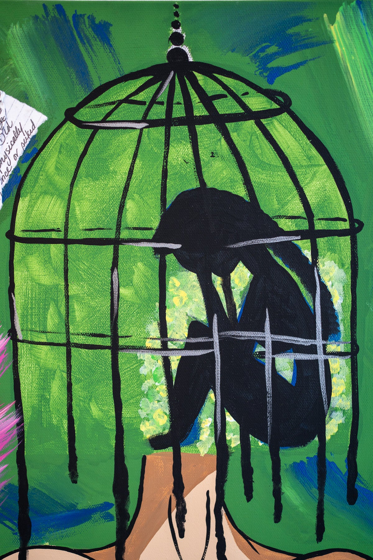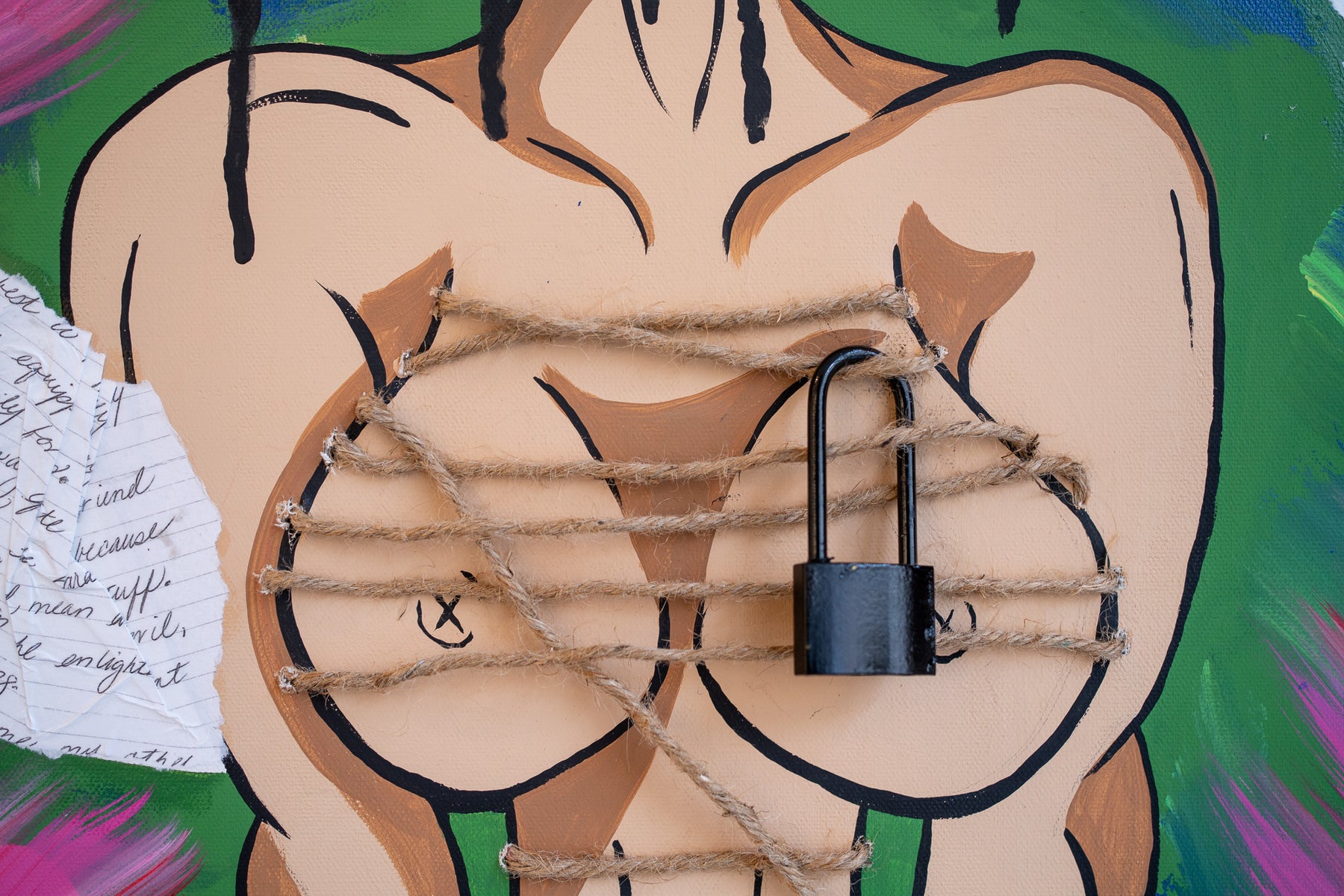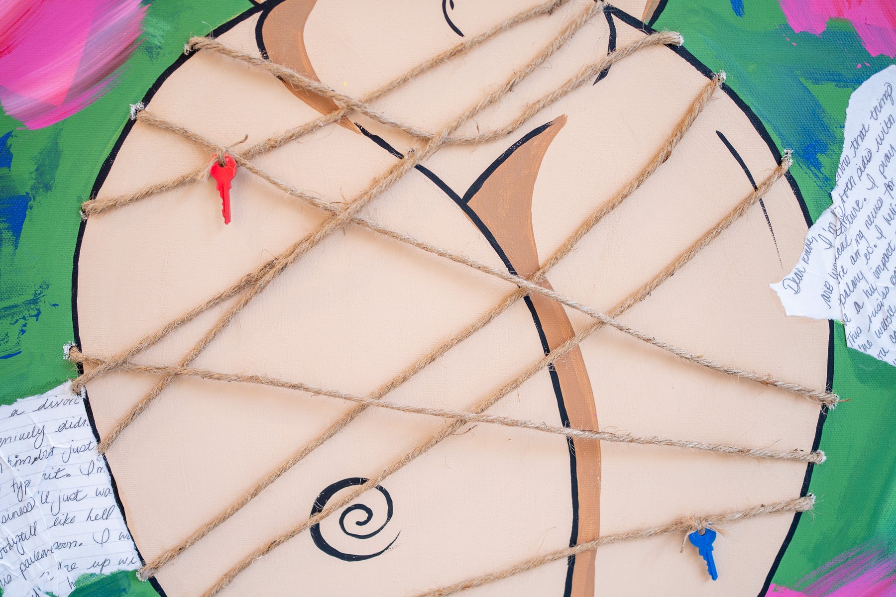 graphic rendition of naked headless womans body, rope covering nudity and locks with key. love letters and pink and green in background. Birdcage in place of head on body with figure inside