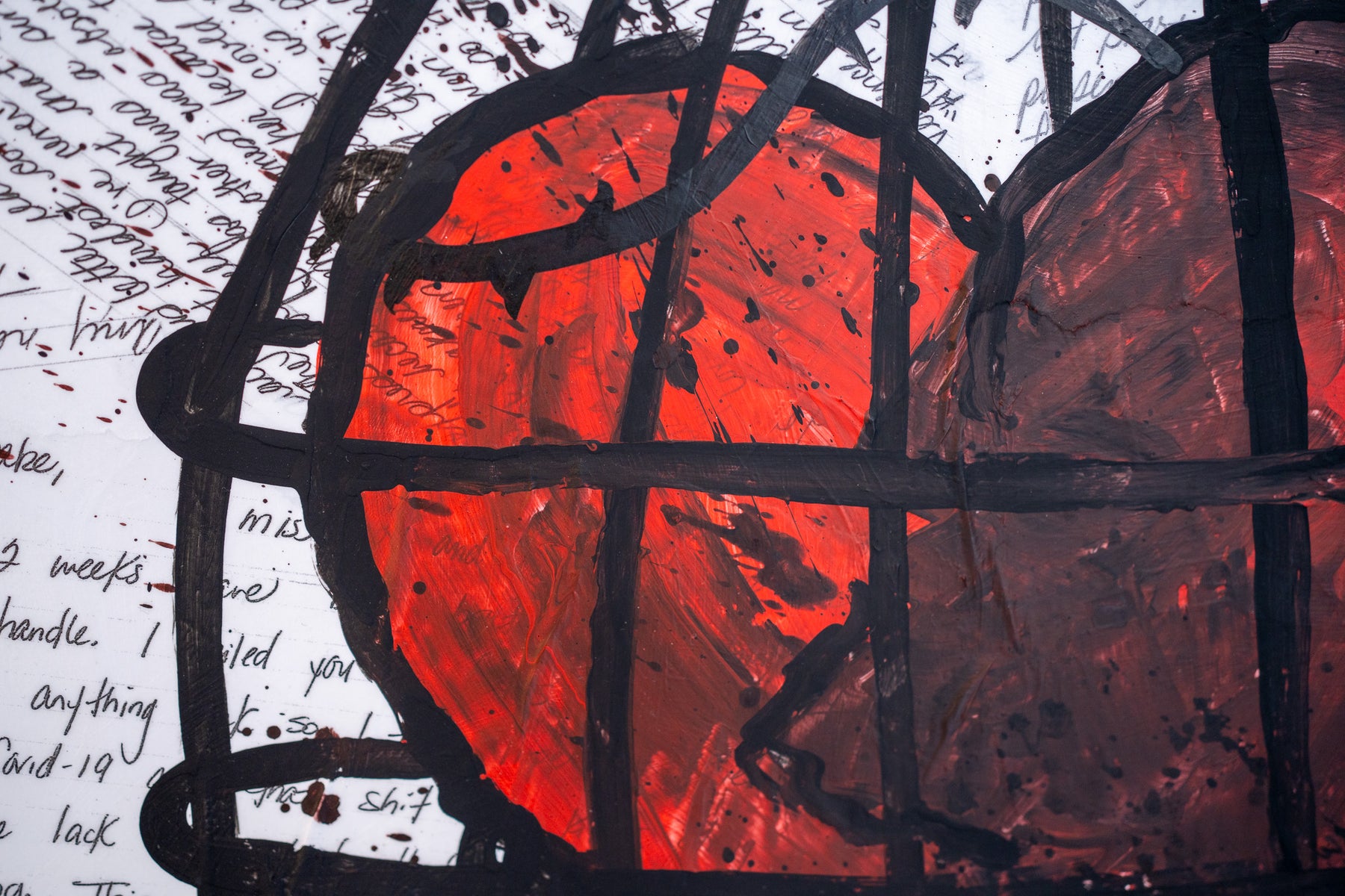 “The two paintings form a cohesive mixed media piece using acrylic paint and old love letters sent throughout the time span of 5 years. One painting depicts the heart inside a cage, symbolizing love constrained by choice. The other painting shows a heart in a similar cage, but this one is representing love caged due to circumstance. Despite the separation, the hearts are connected by an ethereal thread of letters, illustrating the enduring bond of love across distance.” Roxsana Diaz, artist