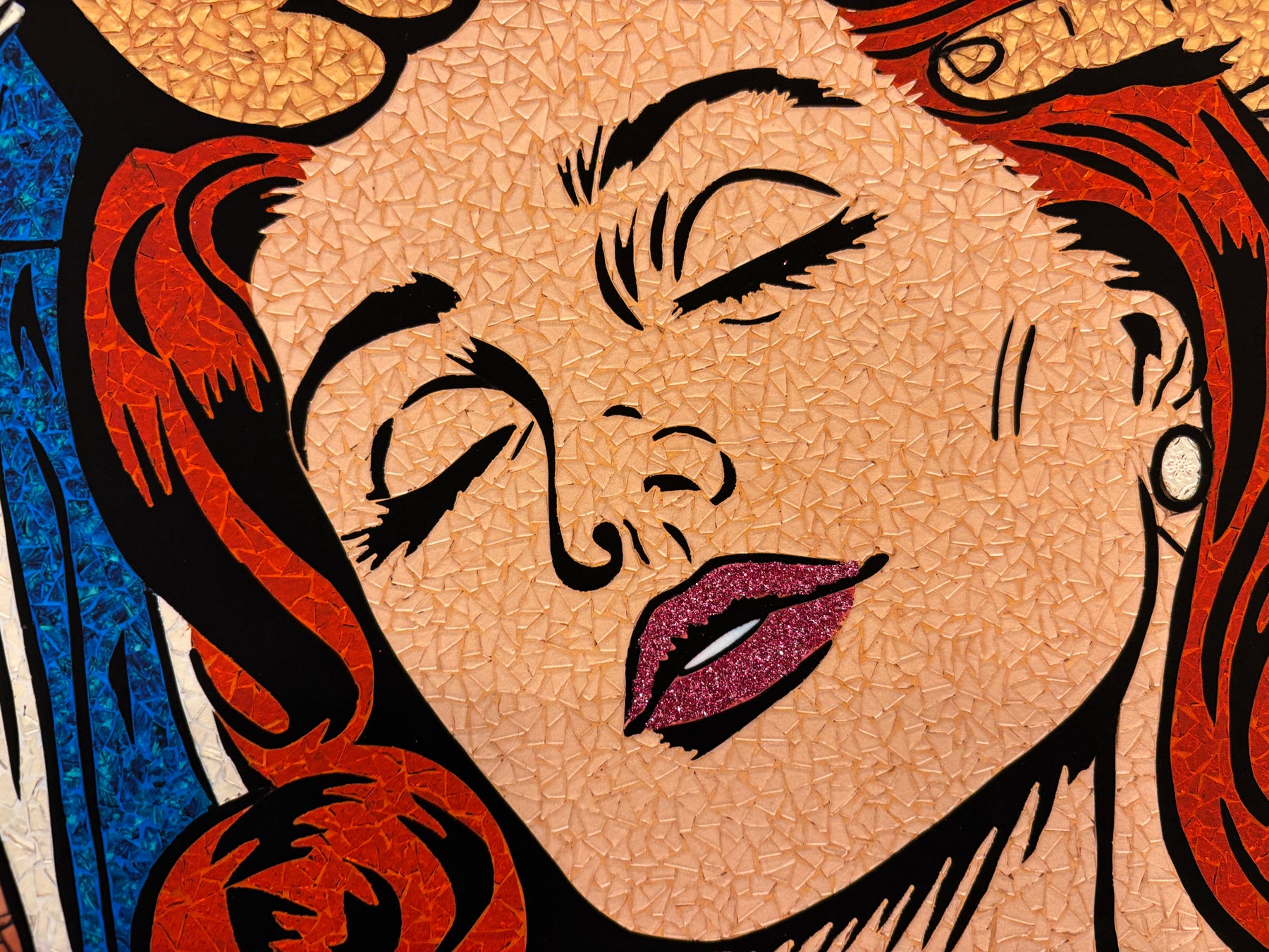 Sarah Fishbein, a contemporary glass mosaic artist based in the Atlantic Highlands of New Jersey, has been pushing the boundaries of visual art for nearly 20 years. Initially grounded in editorial video production, Fishbein artistic journey has led her to embrace the bold, graphic style of Lichtenstein Pop Art Mosaics. She infuses her mosaics with the vibrant, comic-book aesthetic of 1950s and romance comics, creating striking reinterpretations of pop culture through the timeless medium of glass.