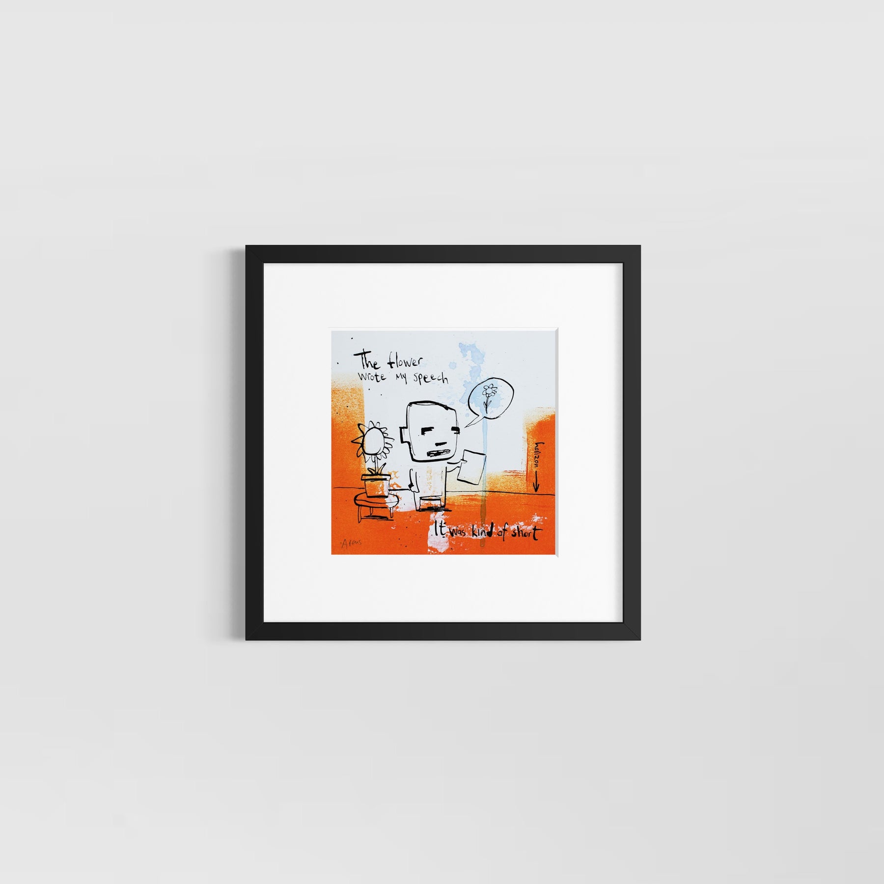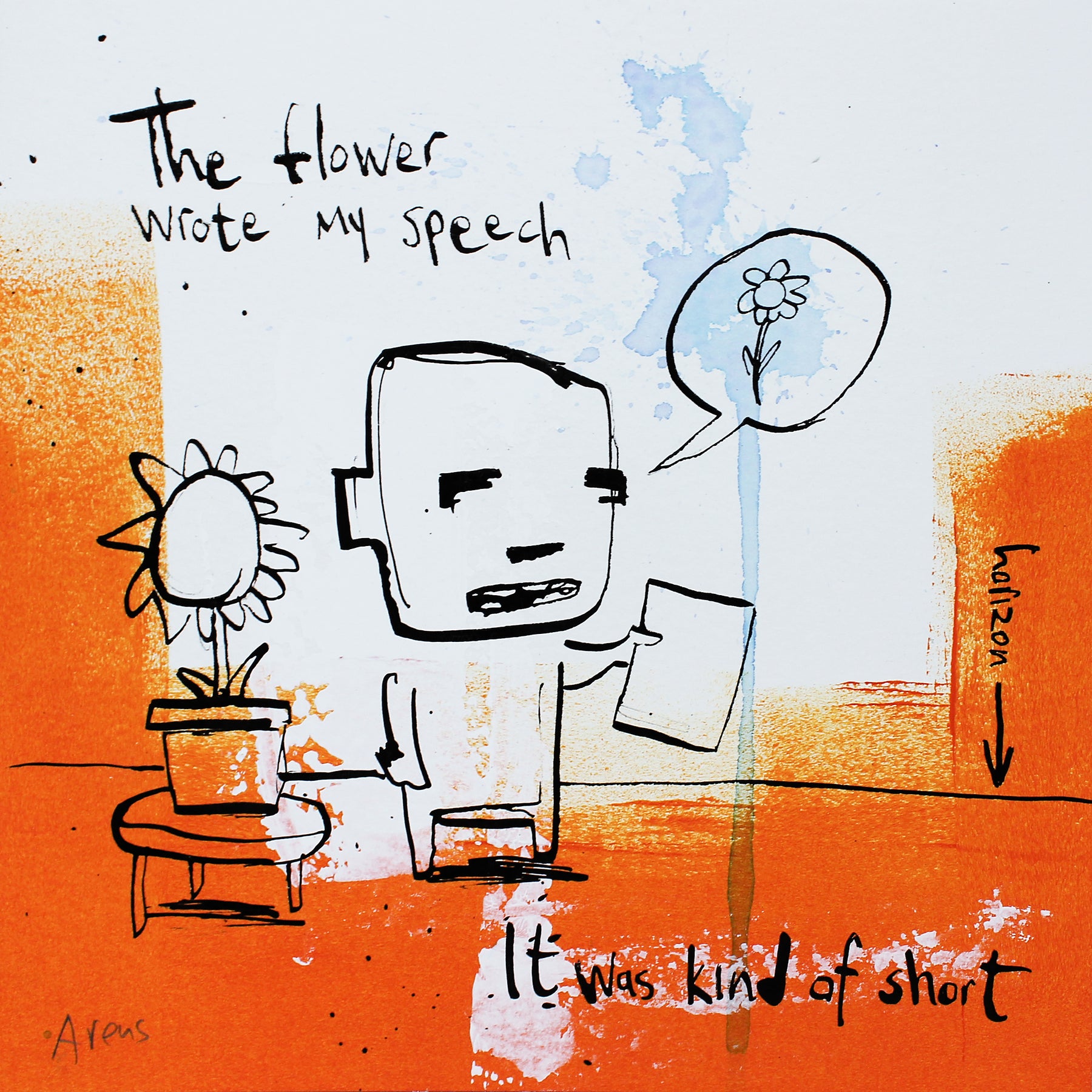 Concentrating on universally understood needs and emotions, Dutch artist Jan-Hein Arens is able to connect with every viewer and admirer of his works. Arens brings together humor and alienation through his paintings. The forefront is typically centered on a simplified figure and text that almost appears to be the thoughts of the figure. Often realistic drawings of body parts, common everyday objects or products are superimposed onto the foreground. Each piece is augmented with additional handwritten text detailing certain aspects of the piece in a comical tone. Paint splatters and rough brushstrokes fill out the remaining space in the paintings, allowing the figures and text to be the focus of each well-thought-out illustration.