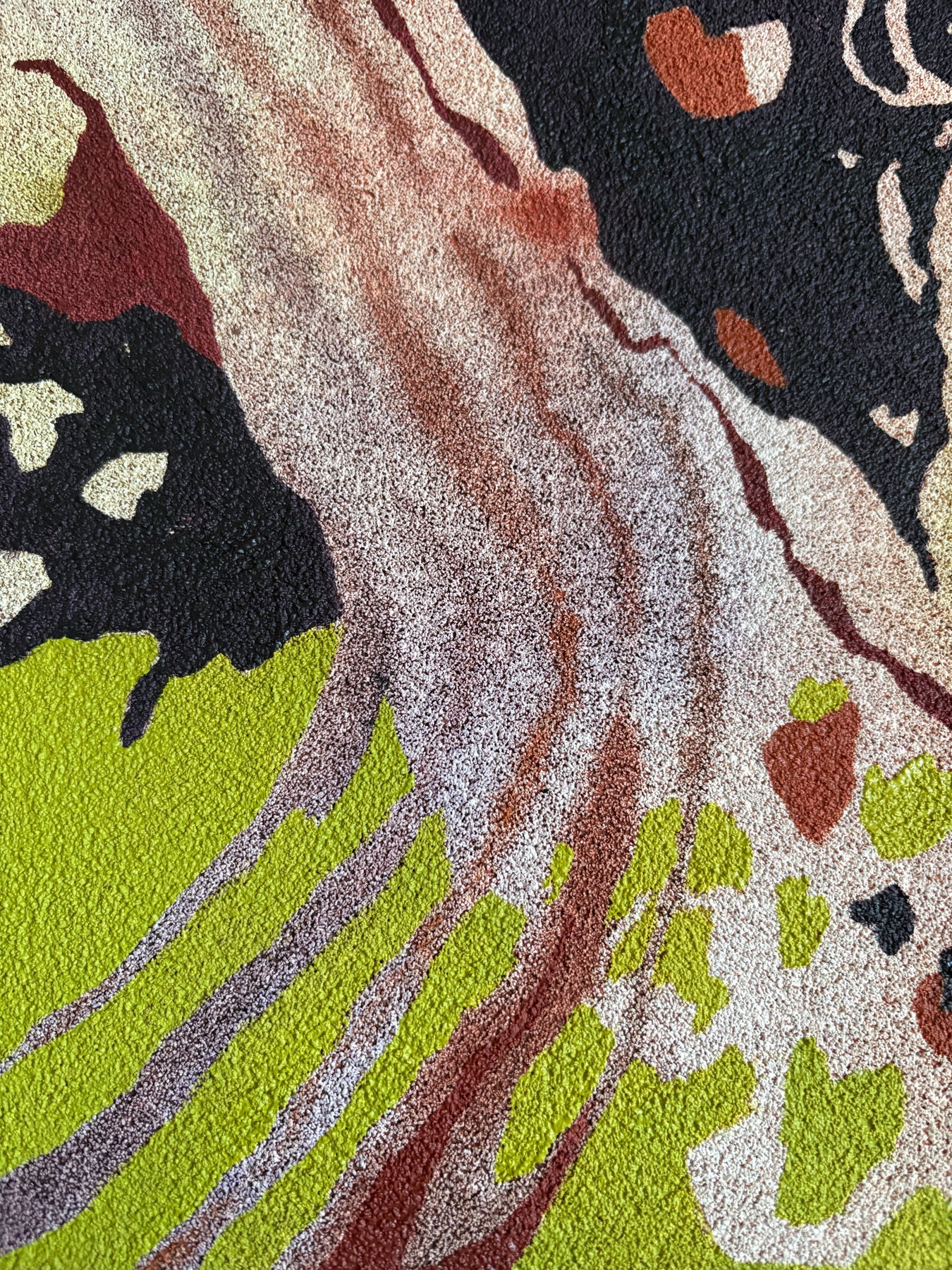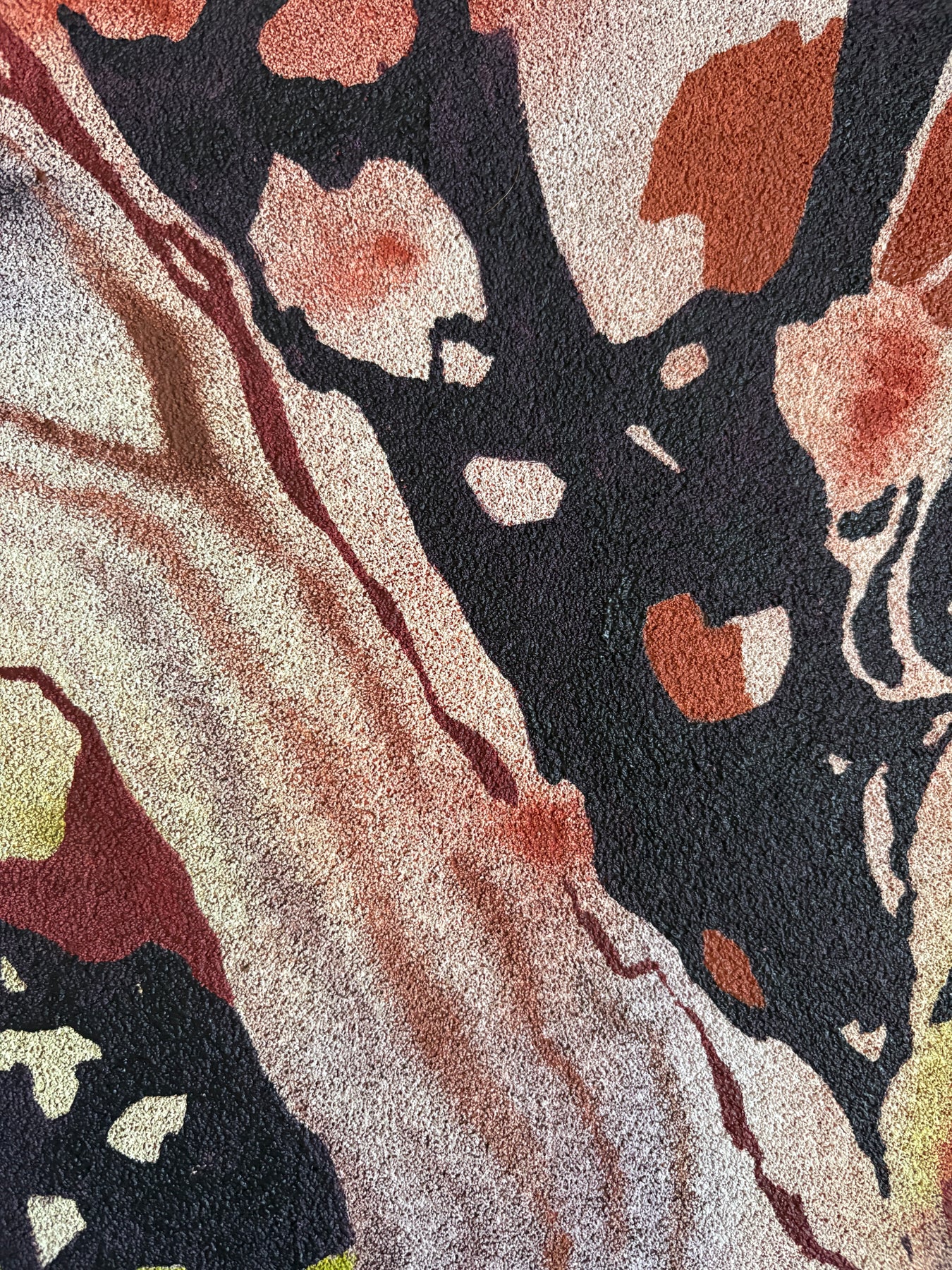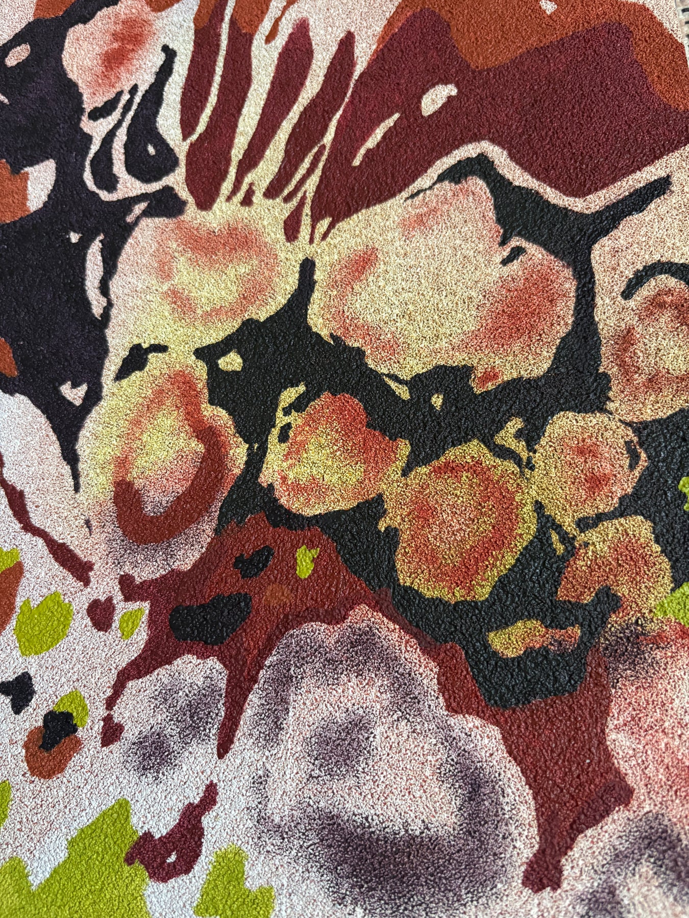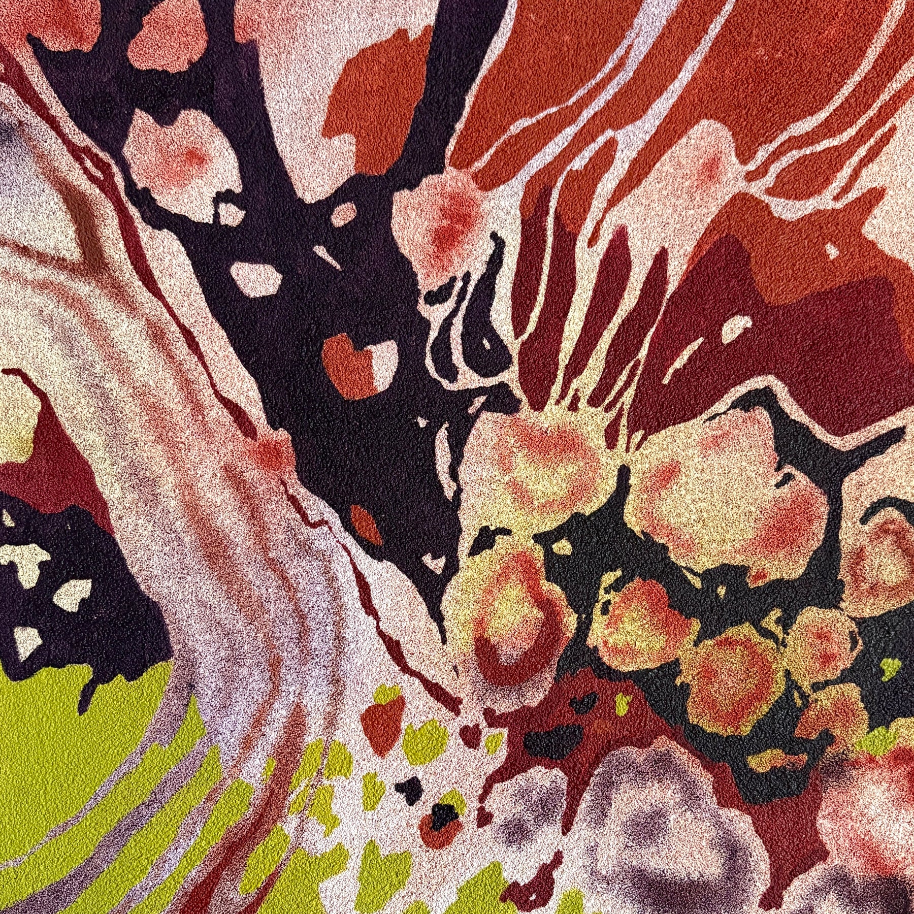 Abstract organic pumice painting in oil paint by local female artist  natural shapes textures abstracted negative space line weight gradient of color purple greens and red orange circular orbs
