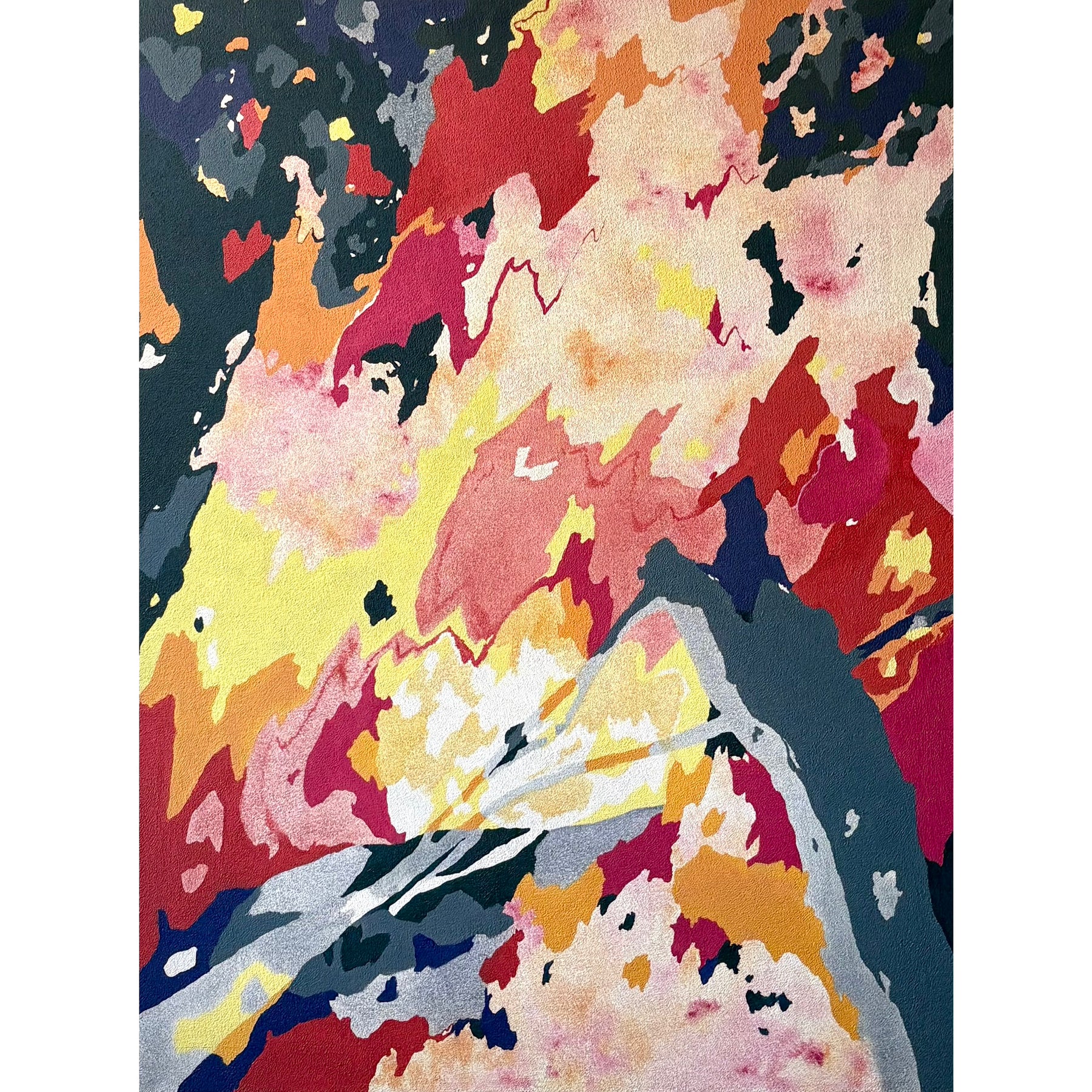 Erin Touey’s work straddles the line between abstraction and representation in her new series of pumice-primed canvas oil paintings. Touey utilizes fluid shapes, variation of line weight, non representational color, distortion of perspective, and in this series, the texture of the pumice primed canvas to bring her often tangible subject matter into the abstract realm. With a limited palette consisting only of Phthalo Blue, Cadmium Yellow, and Quinacridone Magenta, Touey challenges herself to mix all of her colors. The white of the canvas is preserved deliberately, the negative space making shapes that sometimes jump forward or fall back.