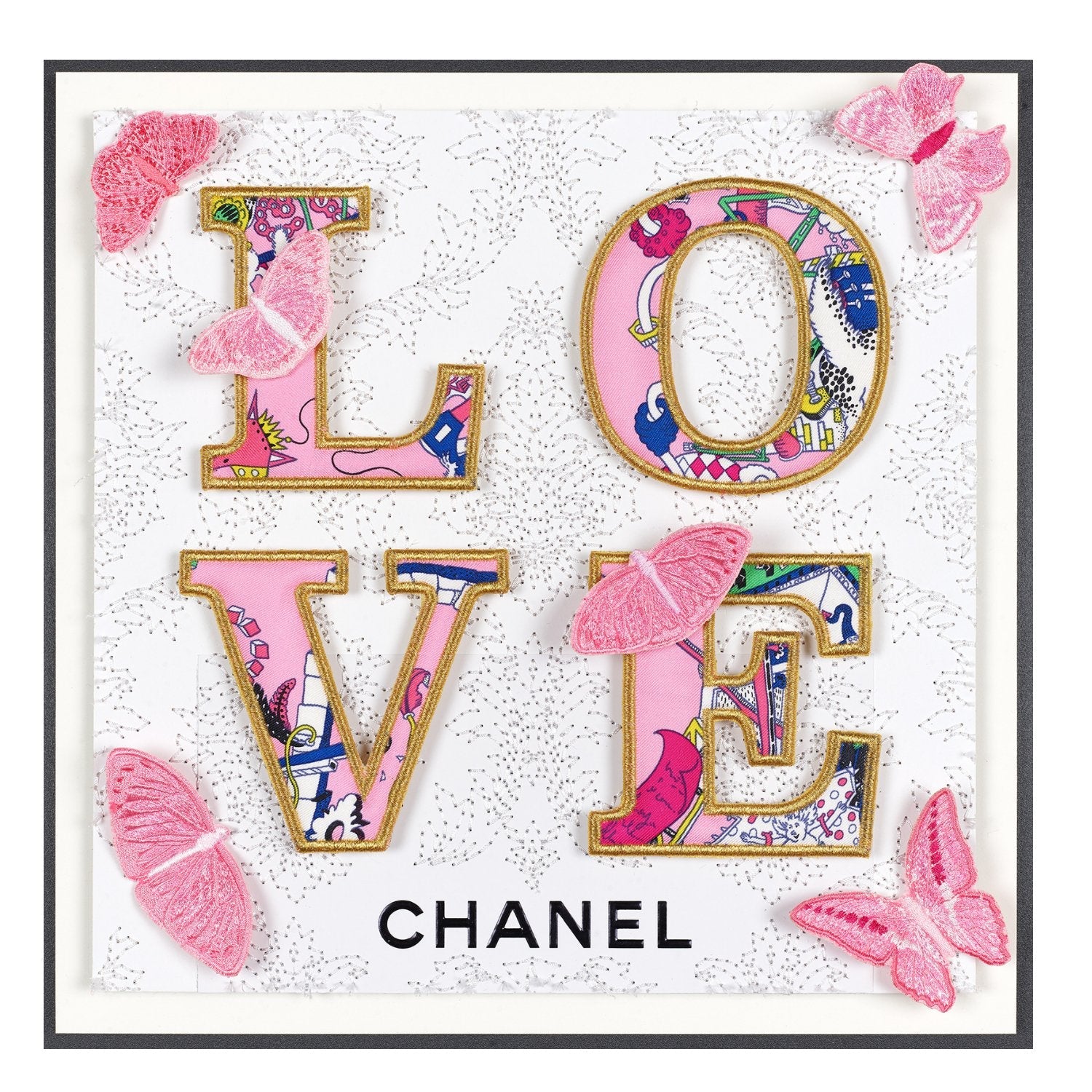 The Love pieces begin with a background created from luxury boxes and bags that have been deconstructed and then directly embroidered. The typography is made using a luxury brand silk scarf. The scarf is embroidered, appliquéd, and then affixed to laser-cut acrylic before being mounted in relief to the background. The butterflies are all individually embroidered to harmoniously blend with the scarf colors and are added to create a dimensional effect.