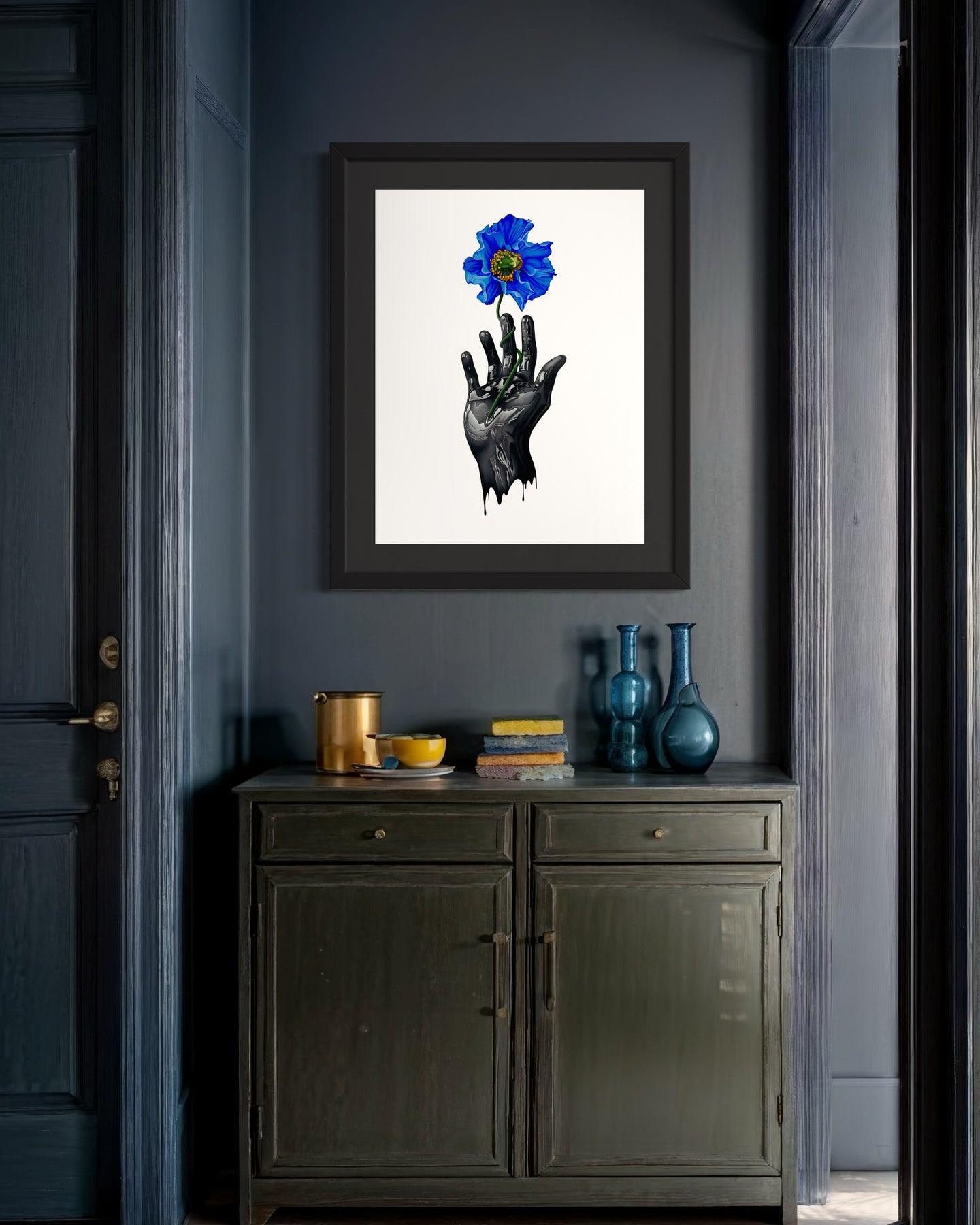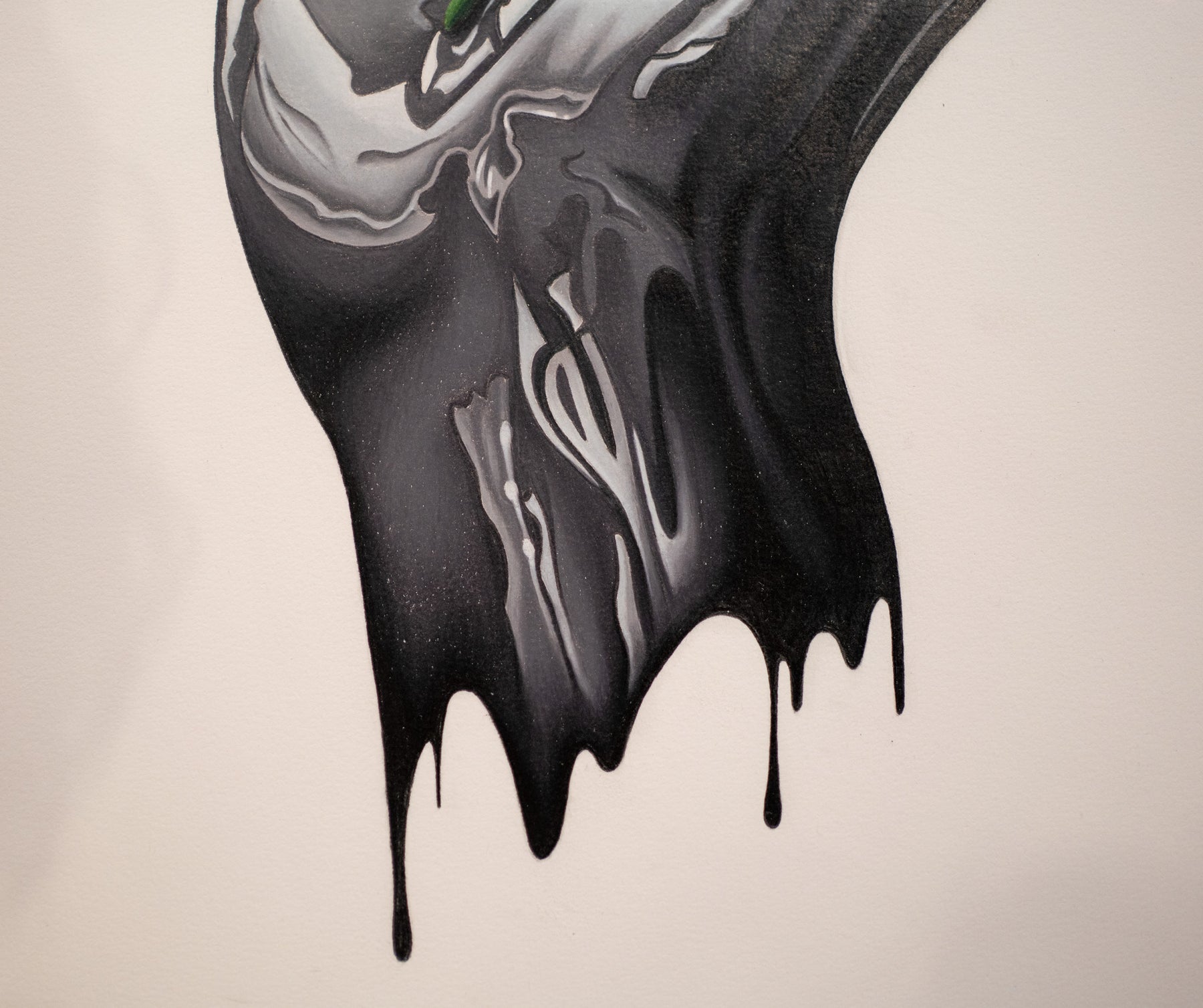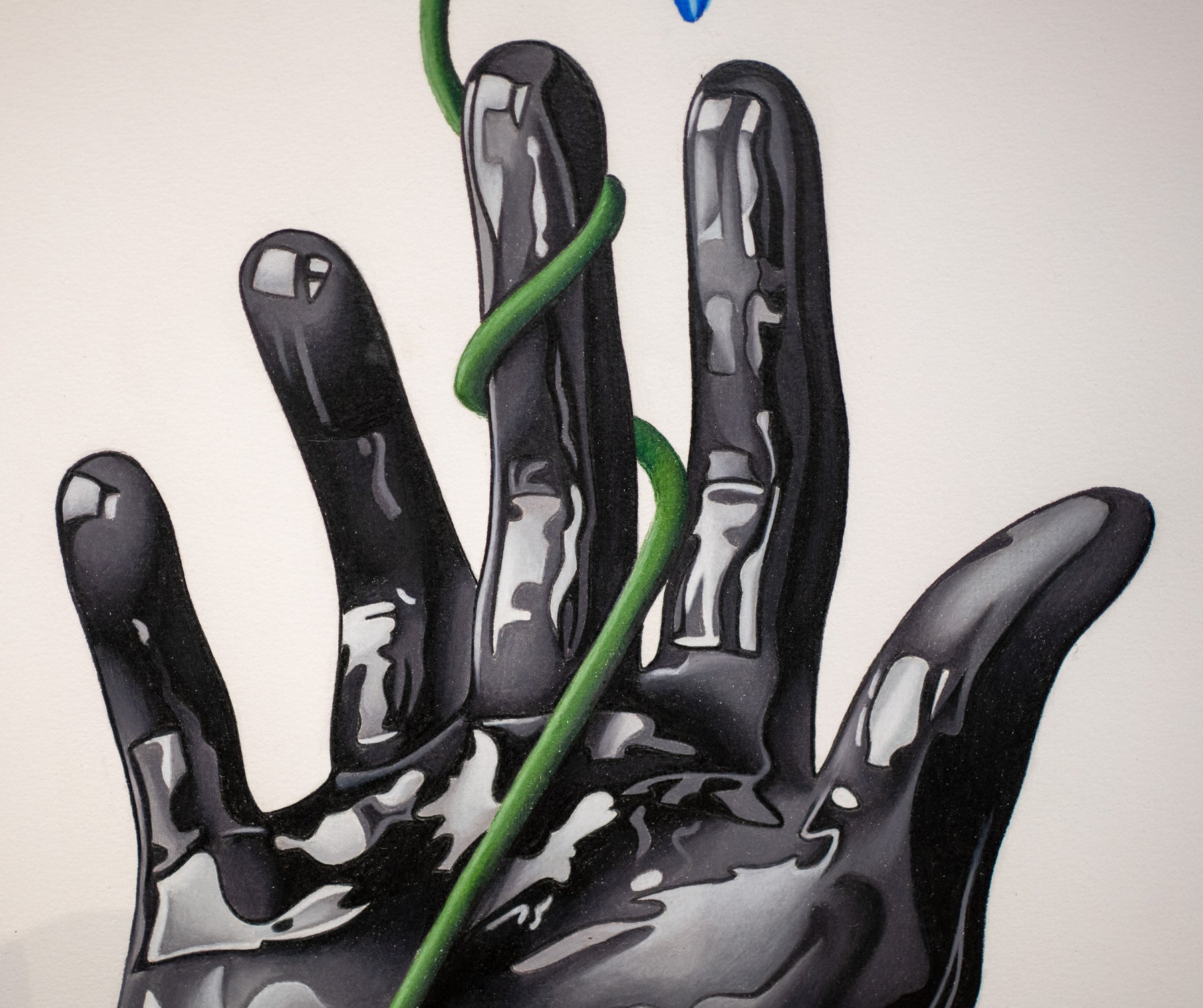 Tanner Valant creates hyper-realistic, unexpected image pairings—fish swim around M.C. Escher-like spheres, paint-dripping hands hold bonsais, and classical busts are drenched in mercury-like liquid—challenging viewers to explore themes of balance, duality, and human interaction through dark, mystical elements. At just 19, Valant, an emerging artist at the Art Institute of Chicago, achieves stunning precision using colored pencils, pens, airbrushes, and markers. As his technique evolves, he aims to engage critically with society, incorporating familiar objects to reflect our changing world.