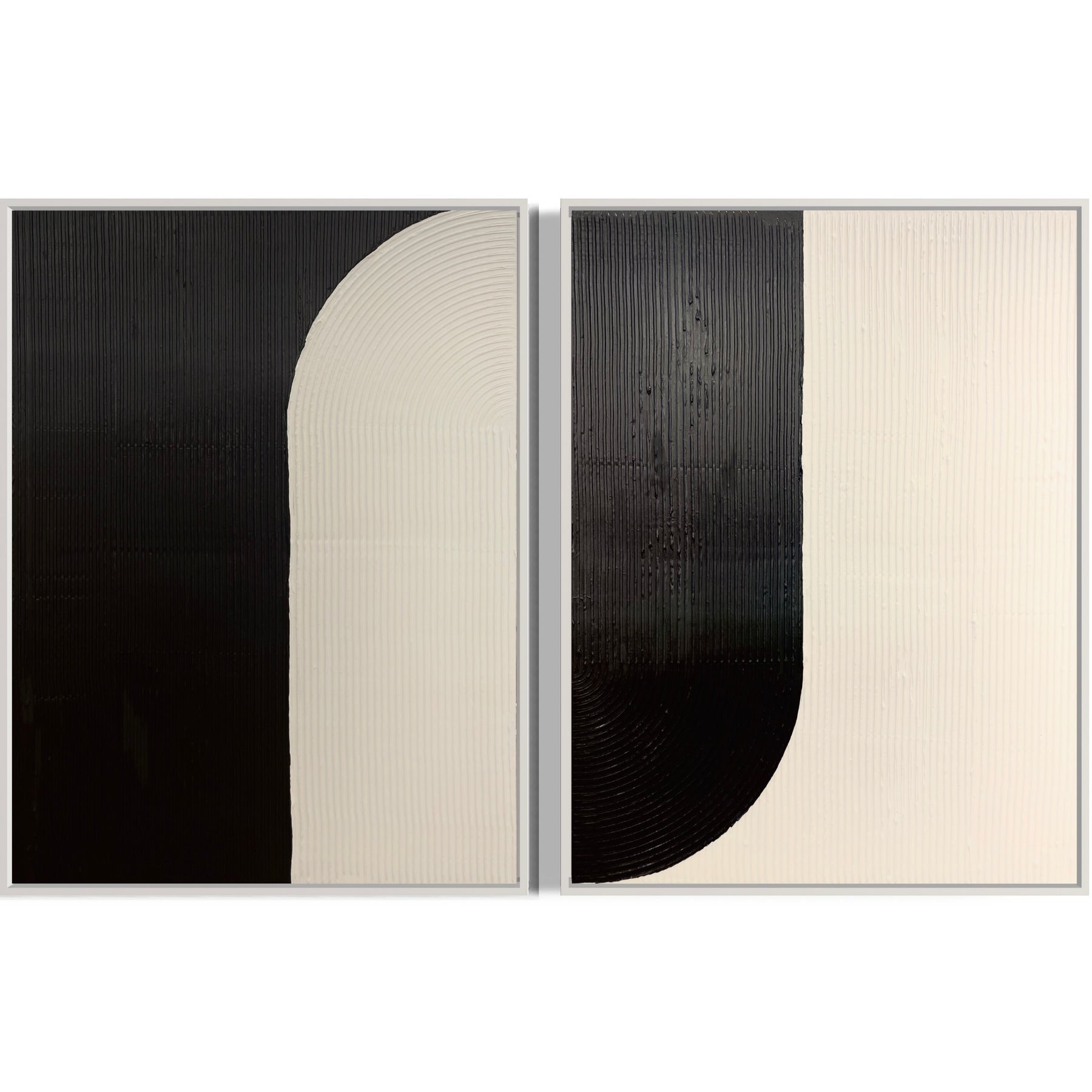 Jerilee, a Philadelphia-based artist working under the name ‘Lee in Cerulean’, creates striking minimalist pieces. For Lee, simple curves, asymmetry, and overlapping forms reflect the beautiful world around us—and find, within our surroundings, the continuity, serendipity, and at times mundane nature of everyday life. Deriving from the Japanese Wabi-Sabi philosophy’s embrace of imperfection, highly textural pieces show Lee’s freeform strokes, using a blend of joint compound, acrylic paint, and a myriad of other media. Under this philosophical orientation, ridges and built-up materials are a reminder that we continue to evolve, just as nature does.