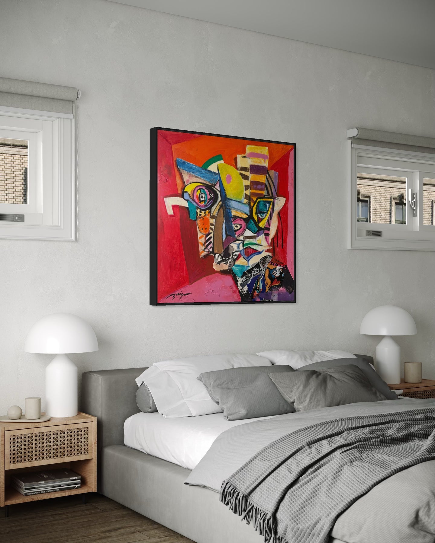 abstract portrait collage eyes bright colors and shapes with ed pink green yellow blue