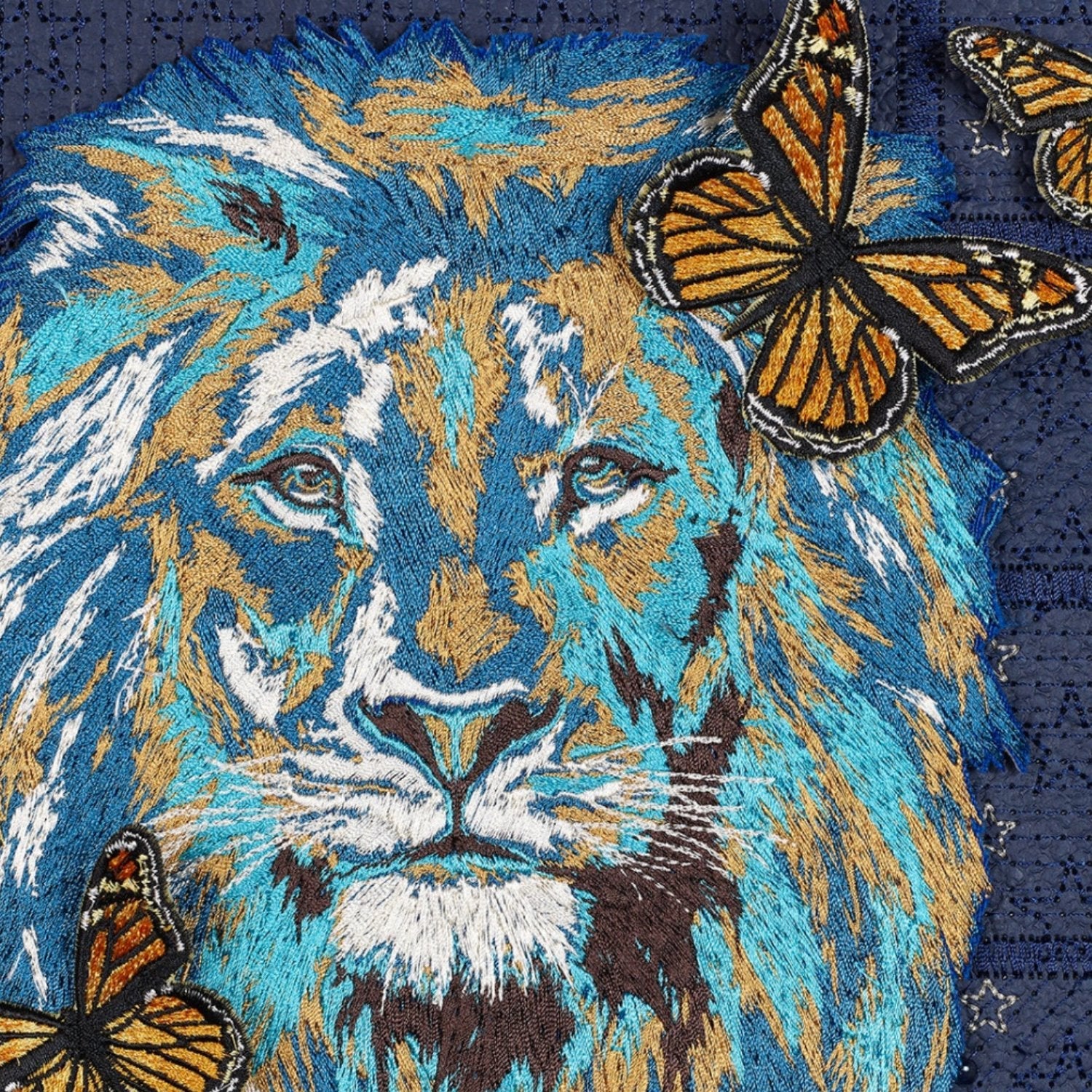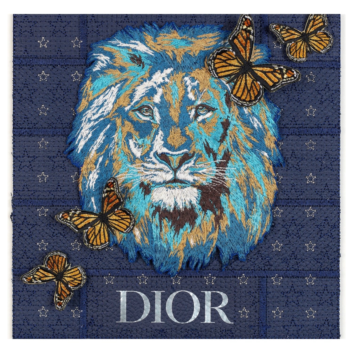The lion represents strength and was one of the first large scale pieces that Stephen created in this series. The background is created using a single luxury bag or box decorated with stars or other decorative details and the lion is created entirely from thread. Once the lion is embroidered it is mounted in relief off of the background. The Lion pieces are available using the packaging from any brand and in multiple color variations. This is a truly customizable piece.