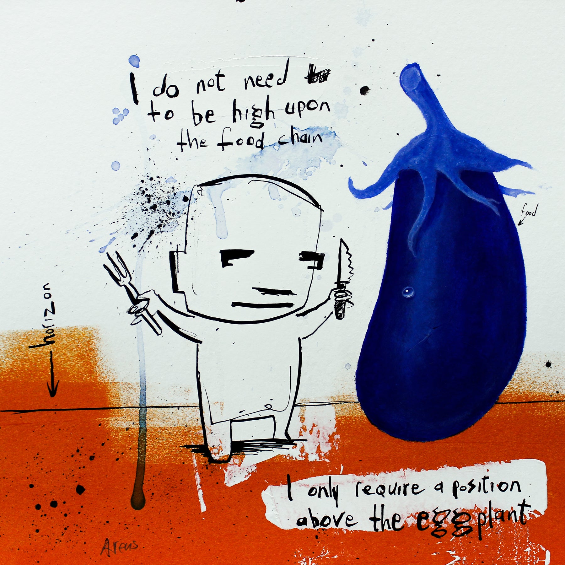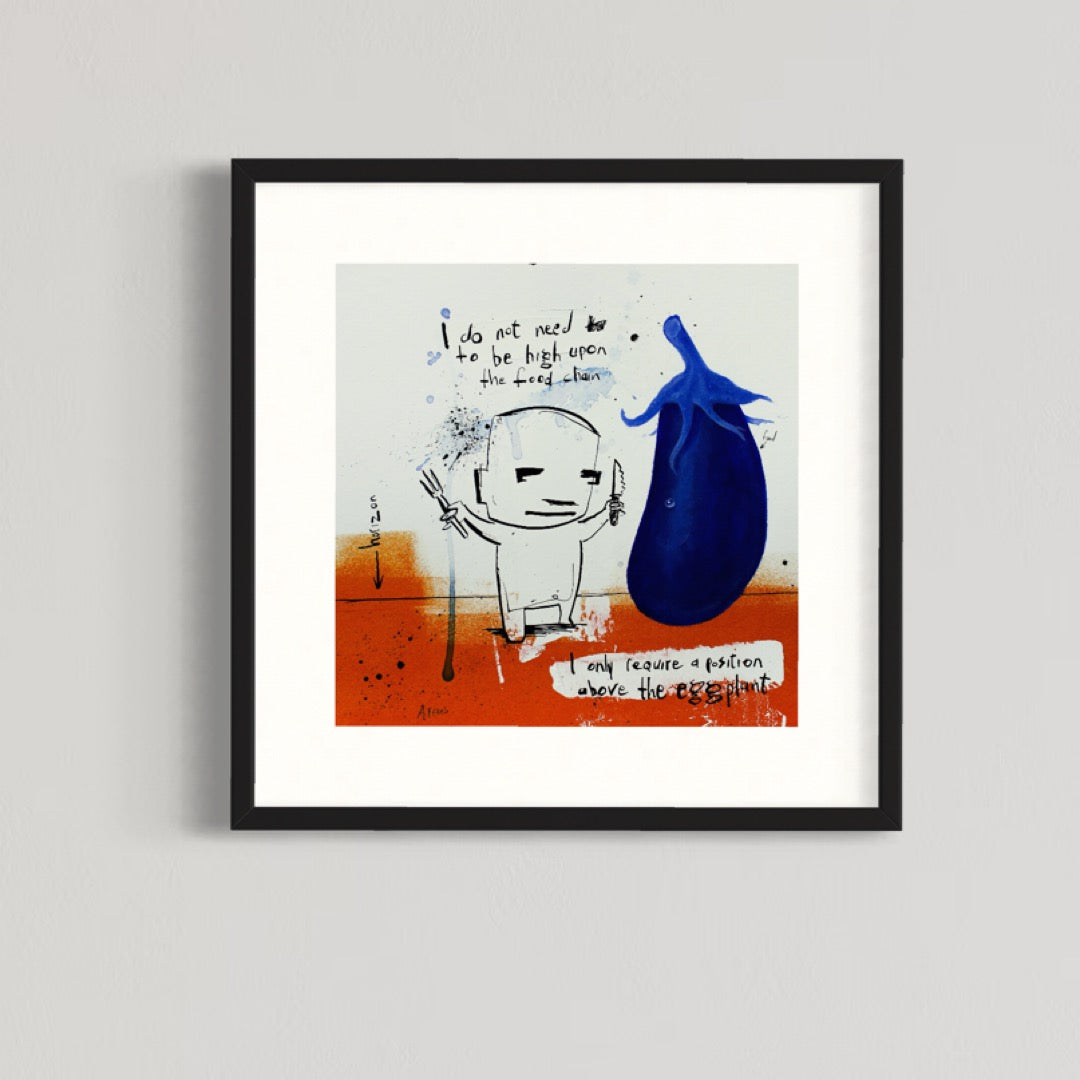 Concentrating on universally understood needs and emotions, Dutch artist Jan-Hein Arens is able to connect with every viewer and admirer of his works. Arens brings together humor and alienation through his paintings. The forefront is typically centered on a simplified figure and text that almost appears to be the thoughts of the figure. Often realistic drawings of body parts, common everyday objects or products are superimposed onto the foreground. Each piece is augmented with additional handwritten text detailing certain aspects of the piece in a comical tone. Paint splatters and rough brushstrokes fill out the remaining space in the paintings, allowing the figures and text to be the focus of each well-thought-out illustration.