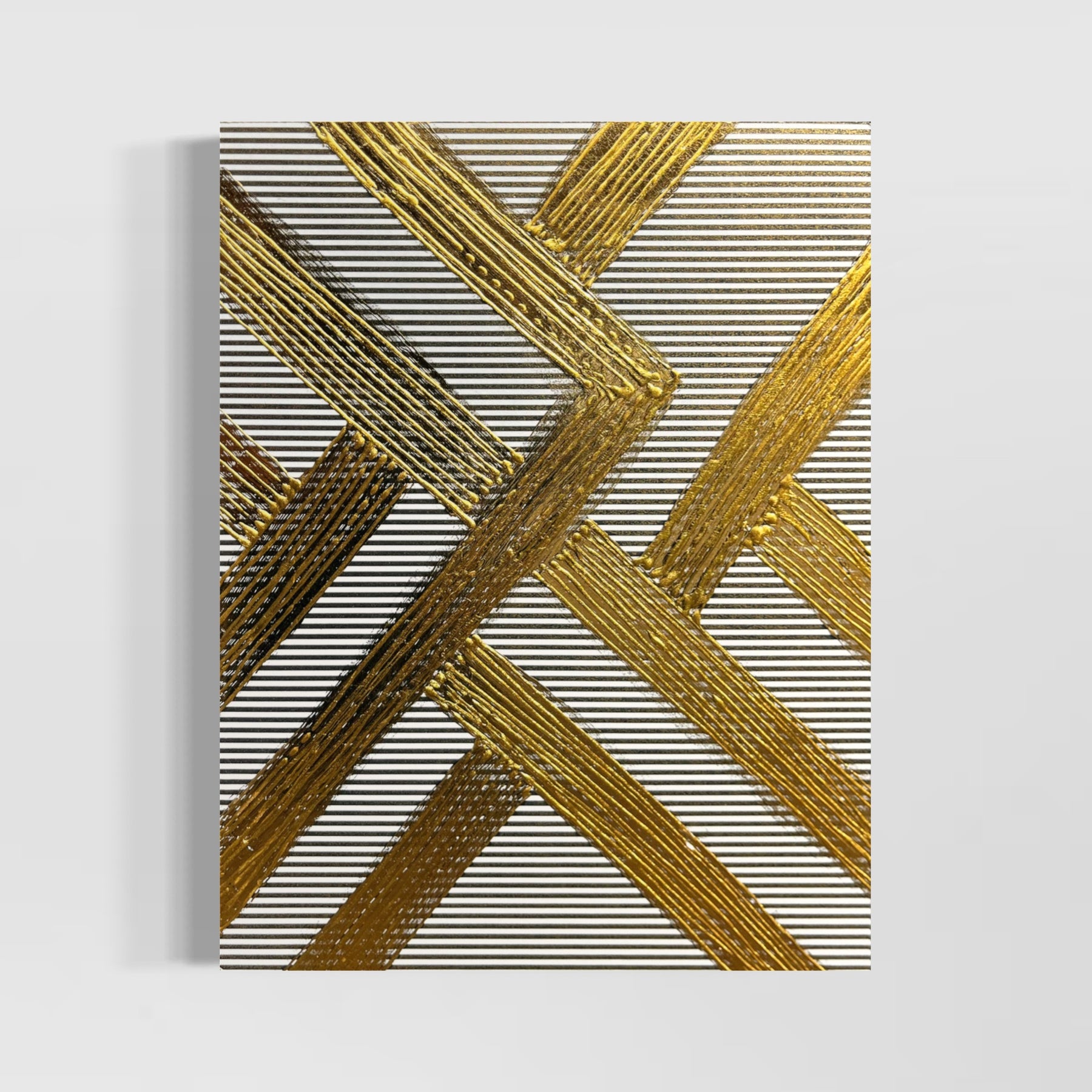 NYC based artist, M. Clark, creates light-reflecting works wherein the artist manipulates heat and pressure to fix metallic foil onto various surfaces -- there is no paint on her artworks, only gold, copper, or silver foil. Clark often uses a palette knife to help texturize her highly reflective, modern and minimalist works of art.
