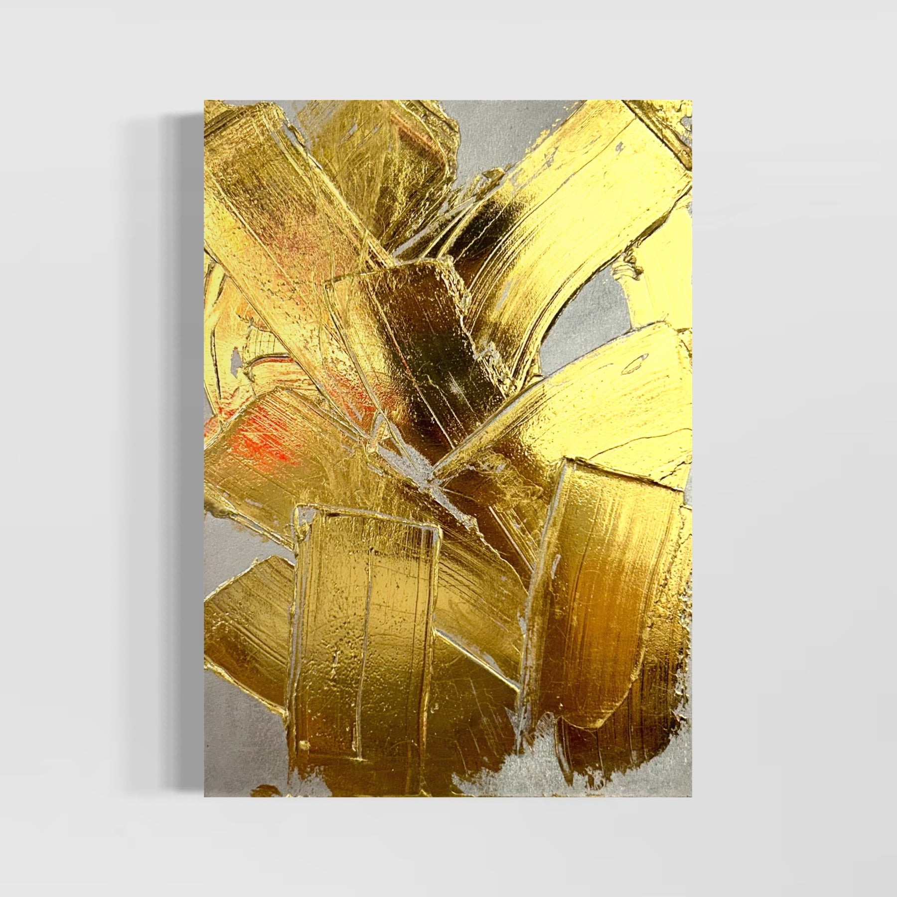 NYC based artist, M. Clark, creates light-reflecting works wherein the artist manipulates heat and pressure to fix metallic foil onto various surfaces -- there is no paint on her artworks, only gold, copper, or silver foil. Clark often uses a palette knife to help texturize her highly reflective, modern and minimalist works of art.