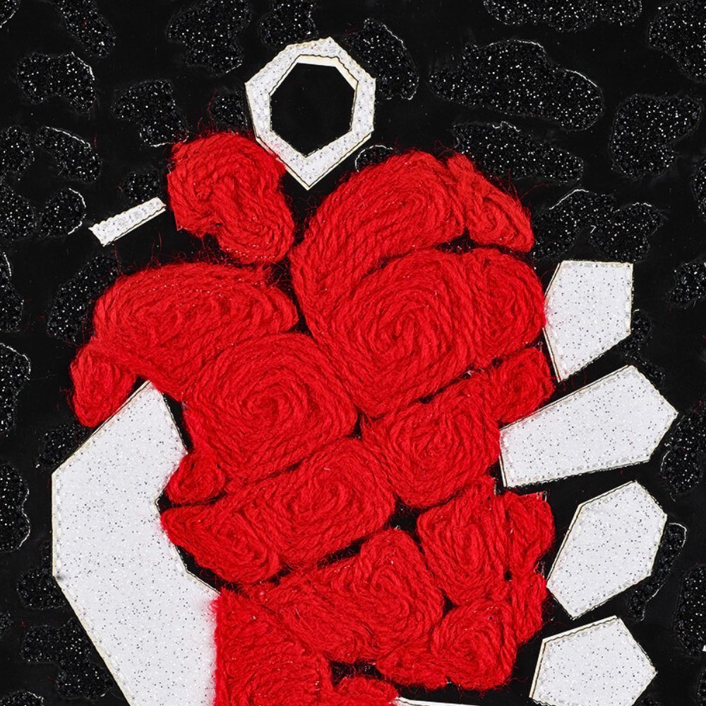 "I have been a fan of Green Day since the early days but American Idiot is my favorite album of theirs. I have always thought of this as a play. In fact, they turned it into one that ran for a few years. The graphics are great for this cover. They remind me of vintage propaganda posters from the color war. When I was creating the embroidery from the cover, I started by embroidering a leopard print pattern in the background using laser cut fabric, very punk rock. The hand and heart grenade was created using red and white yarn with the logo created as a patch." - Stephen Wilson