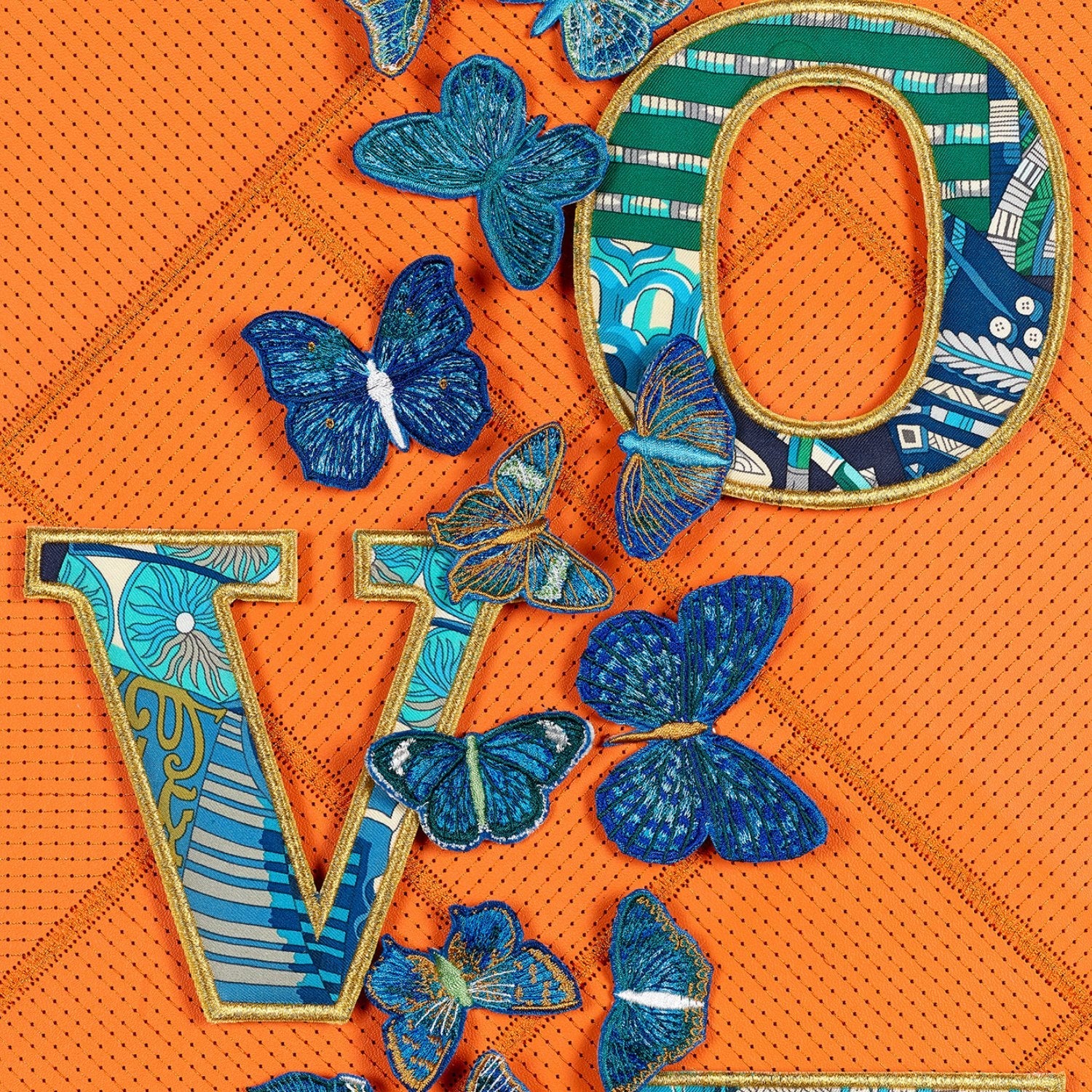The Love pieces begin with a background created from luxury boxes and bags that have been deconstructed and then directly embroidered. The typography is made using a luxury brand silk scarf. The scarf is embroidered, appliquéd, and then affixed to laser-cut acrylic before being mounted in relief to the background. The butterflies are all individually embroidered to harmoniously blend with the scarf colors and are added to create a dimensional effect.