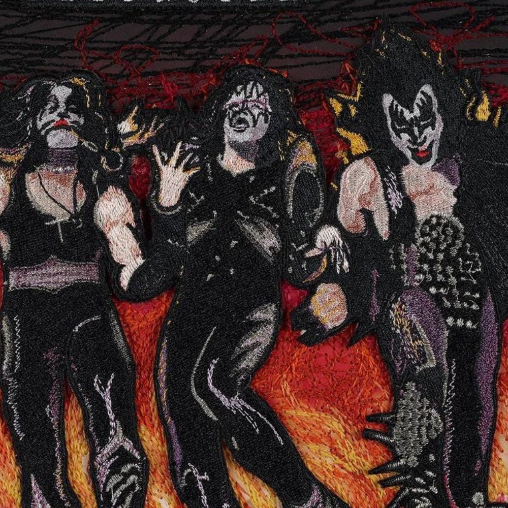 "I became a KISS fan at a very early age, probably around 1977 or so. As one of the first bands to ever create merchandise, dolls, toys, trading cards and lunch boxes were all items that you could purchase. As a kid this was amazing; a rock and roll band that has cool music, singers that spit fire and things you could put on your Christmas list. There wasn’t a kid in the 1970’s that wasn’t a KISS fan. I bought all of their albums, probably through the 90’s and still listen to them today. When it came time to do one of their albums, I chose Destroyer. This was their fourth album, released in 1976, and was their first album to go platinum. The album had hits like Shout it Out Loud, Detroit Rock City, Beth, and God of Thunder. Obviously their album art was also amazing. The cover features a painting of all 4 members in full costume with with a burning city in the background. I started by stitching the background in about 30 different colors of wool thread. I created the band members as a patch, the patch itself is huge with over 50 colors and 100,000 stitches. I also created the logo as a patch and mounted both onto the album." – Stephen Wilson