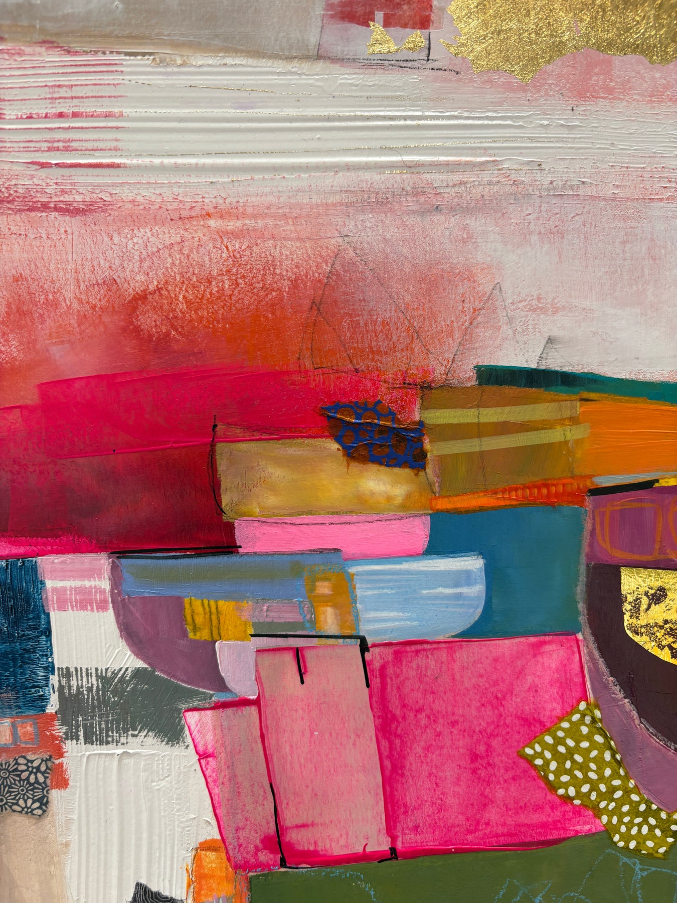 abstract geometric collage of square and semi circle shapes in fabric graphite acrylic paint gold leaf foil in pink green blue stacked and overlapping on pink and white background