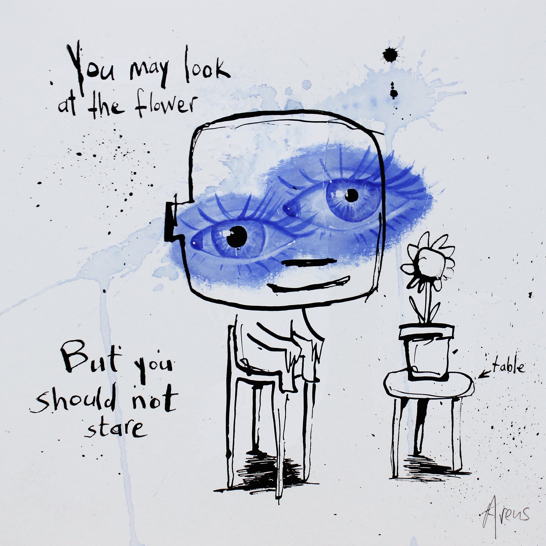 Comic doodle illustration in ink with blue eyes white background line drawing figures funny humor  flower