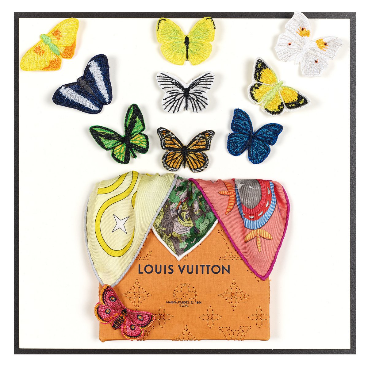 For the Butterfly Surprise pieces, Stephen wanted to recreate a shopping bag out of his up-cycled luxury pieces. The piece starts with a luxury bag that is deconstructed, embroidered and then reconstructed back into a bag shape. Luxury scarf remnants are then draped and mounted so they appear to be flowing out of the bag. Embroidered butterflies are then dimensionally mounted to appear exploding out of the bag.