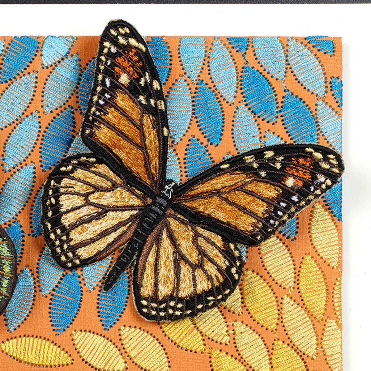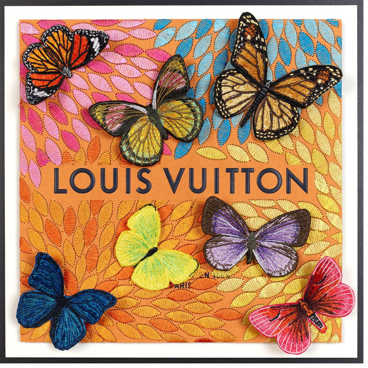 Stephen Wilson expertly crafts extraordinary and timeless designs using sustainable materials. Each art piece embarks on a journey, starting with an up-cycled luxury bag, box, silk scarf, or album. Wilson meticulously creates a bespoke embroidery design, delicately intertwining every stitch by hand. Once the design, colors, and elements are meticulously selected, the artistic process advances to the assembling stage. The boxes and bags undergo a mesmerizing transformation, metamorphosing into captivating canvases for Wilson's creations. The embroidery is seamlessly integrated into the chosen medium, unveiling a captivating texture that breathes life into the artwork. Appliqués, patches, and butterflies are individually stitched out, meticulously crafted, and delicately placed on each piece, culminating in a truly distinctive and unparalleled masterpiece. Finally, each artwork is beautifully presented, encased in an acrylic frame, ready to enchant all who behold it.