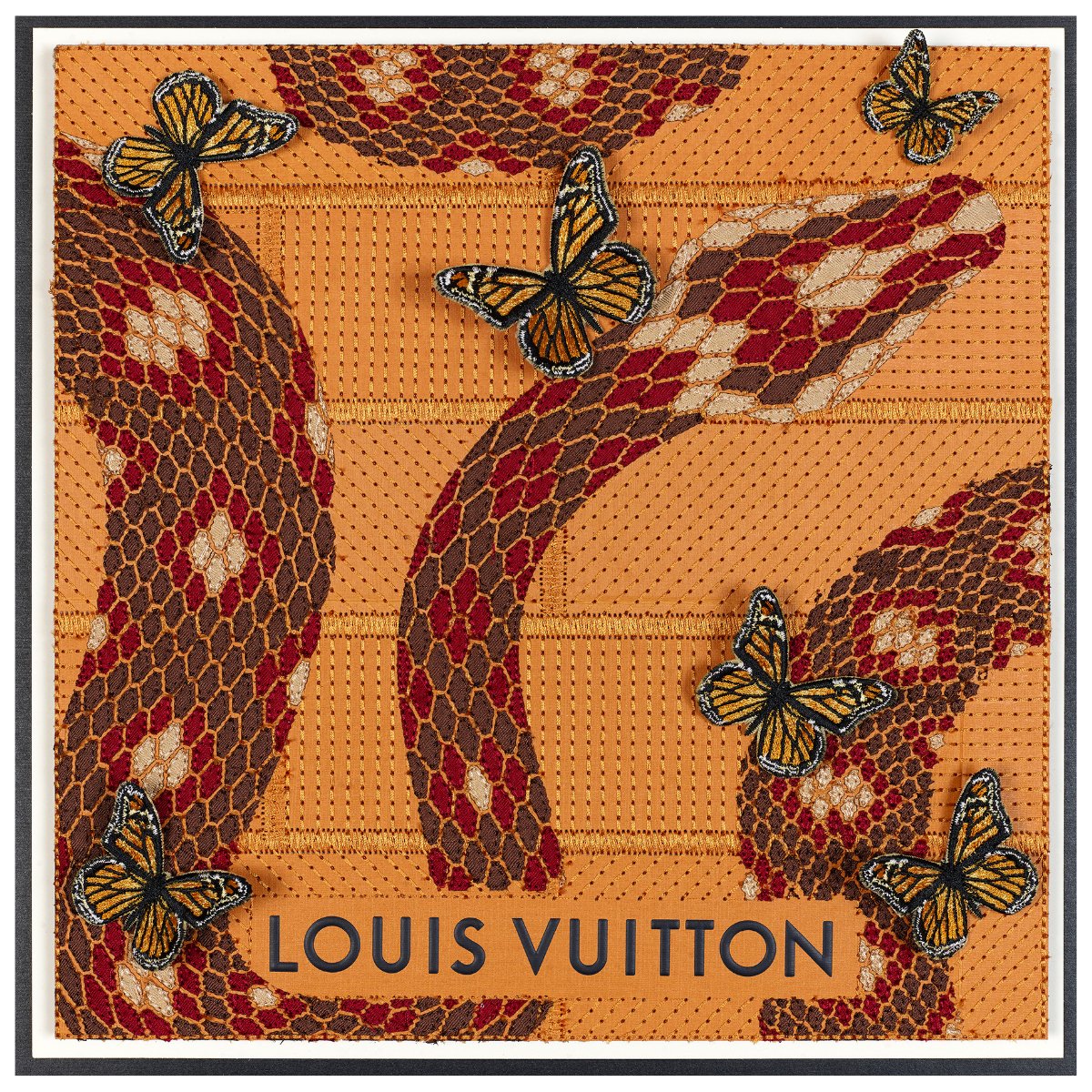 Each serpent is crafted using a multitude of silk appliqué pieces, constructed from rich silk twills blended with luxurious silk scarves. The serpents are then meticulously embroidered onto the luxury boxes, with additional embroidered butterflies enhancing the piece's overall dimension.