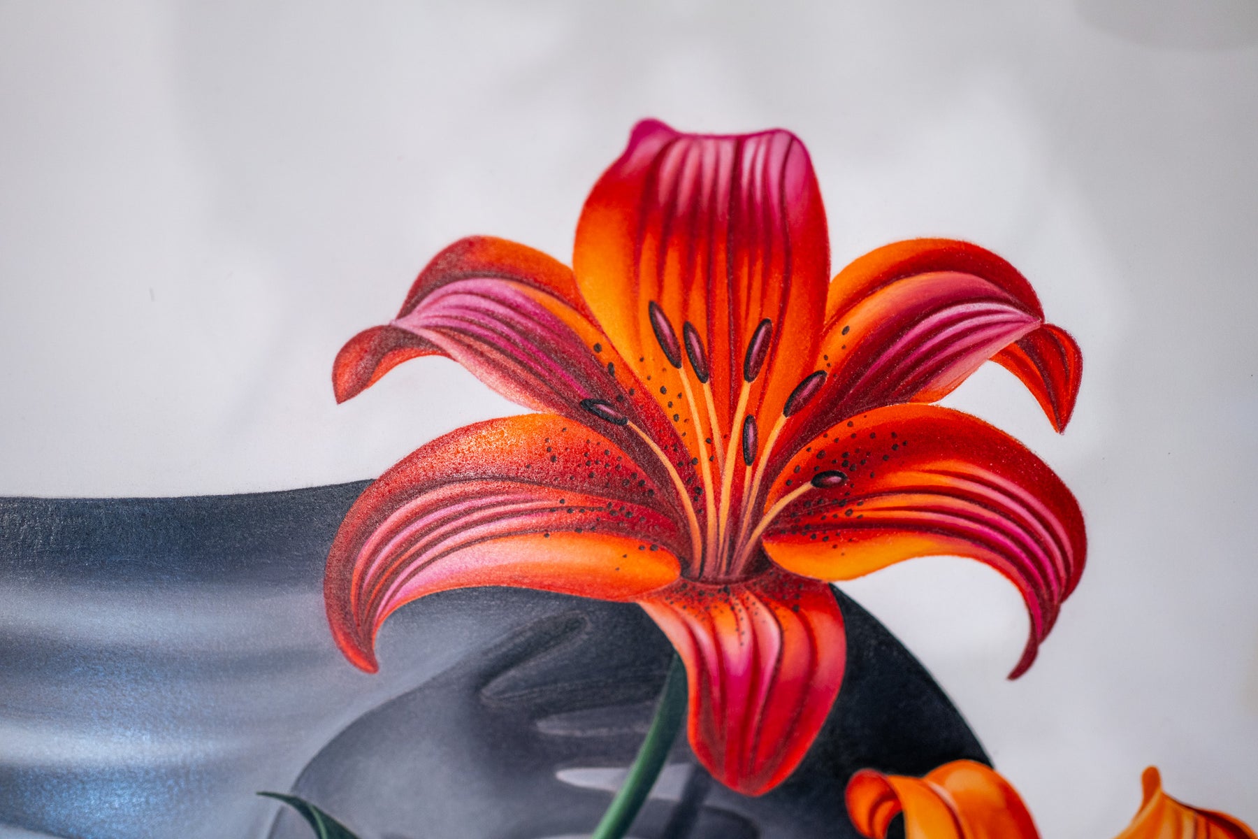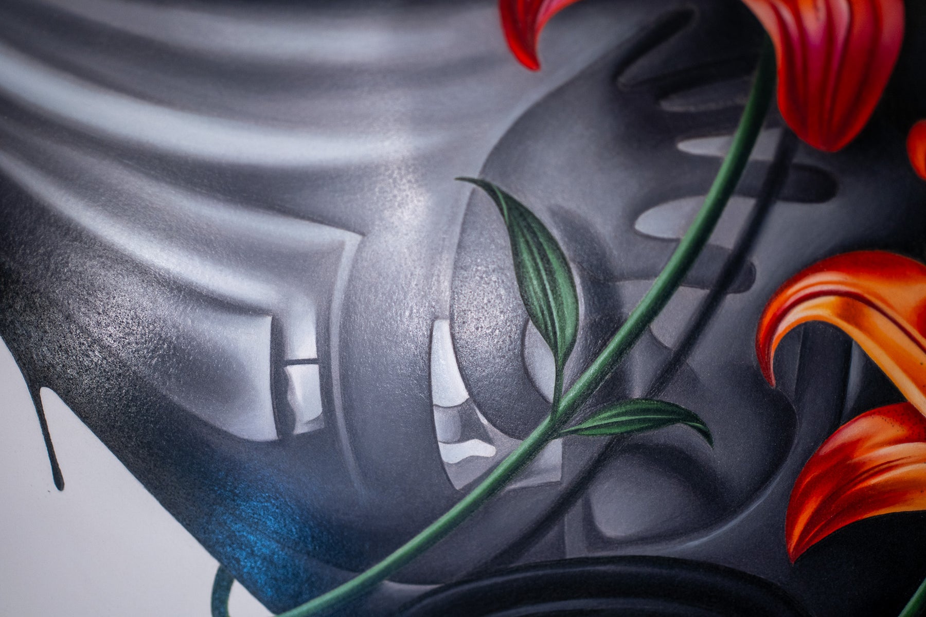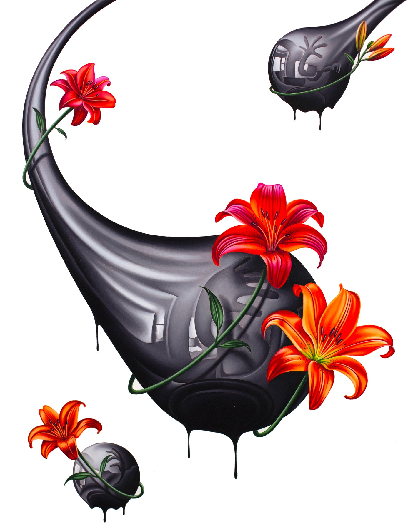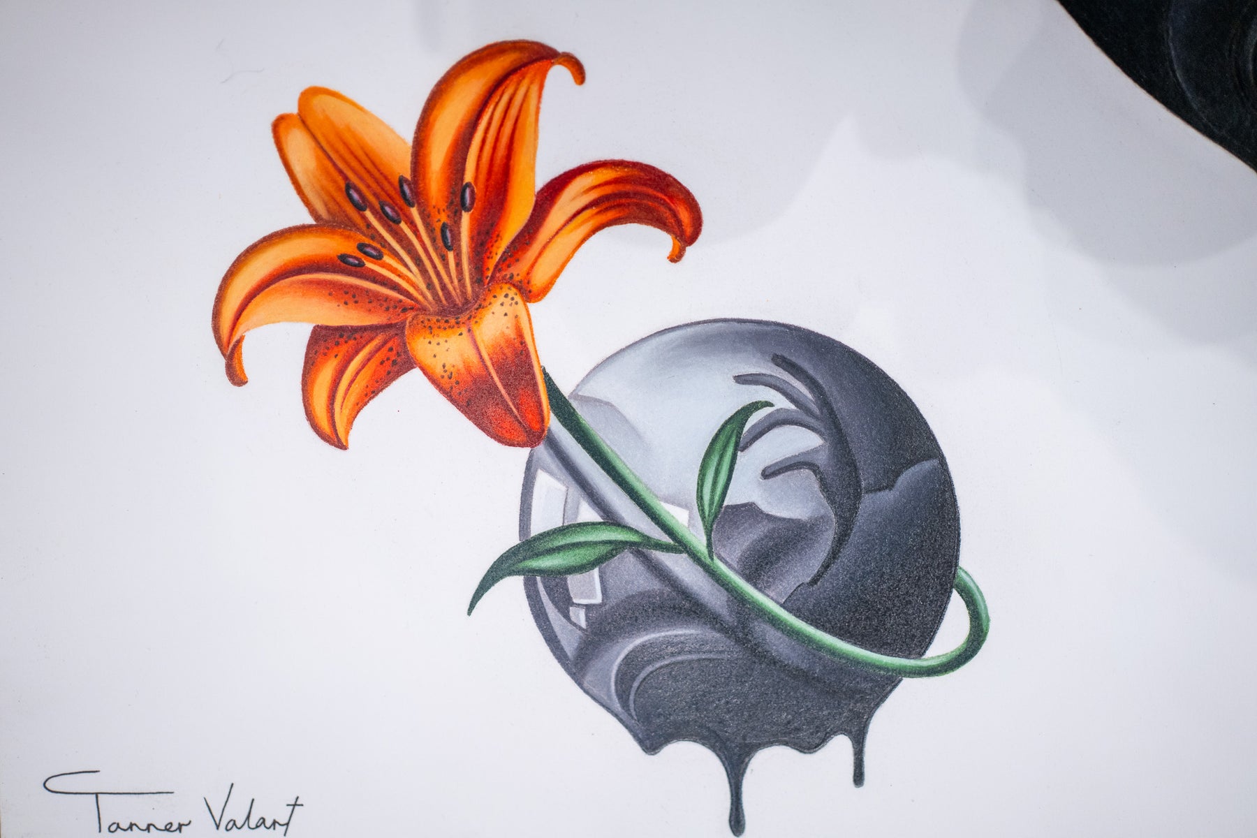 Tanner Valant creates hyper-realistic, unexpected image pairings—fish swim around M.C. Escher-like spheres, paint-dripping hands hold bonsais, and classical busts are drenched in mercury-like liquid—challenging viewers to explore themes of balance, duality, and human interaction through dark, mystical elements. At just 19, Valant, an emerging artist at the Art Institute of Chicago, achieves stunning precision using colored pencils, pens, airbrushes, and markers. As his technique evolves, he aims to engage critically with society, incorporating familiar objects to reflect our changing world.