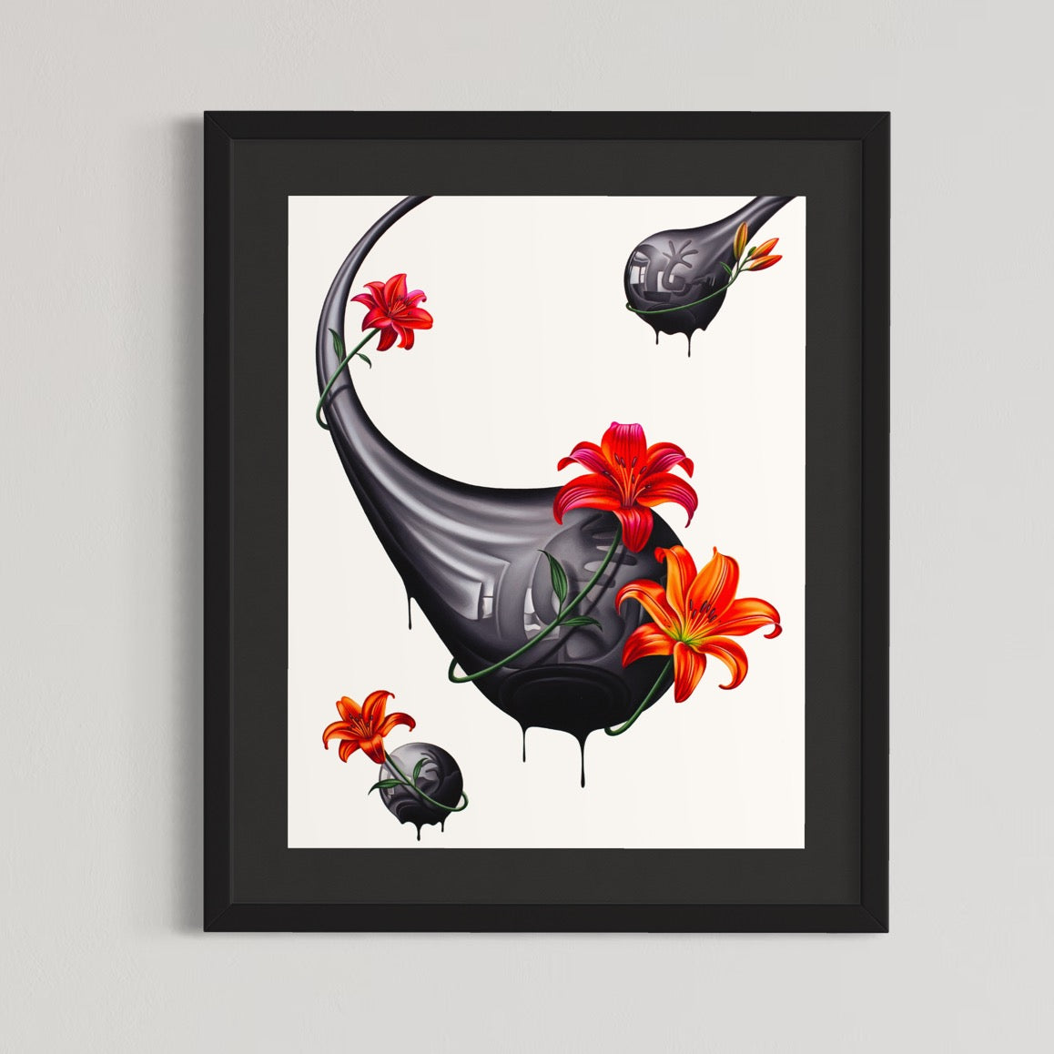 Size: 22"W x 30"H original artwork, framed in a 29"W x 35"H black frame with black matting.