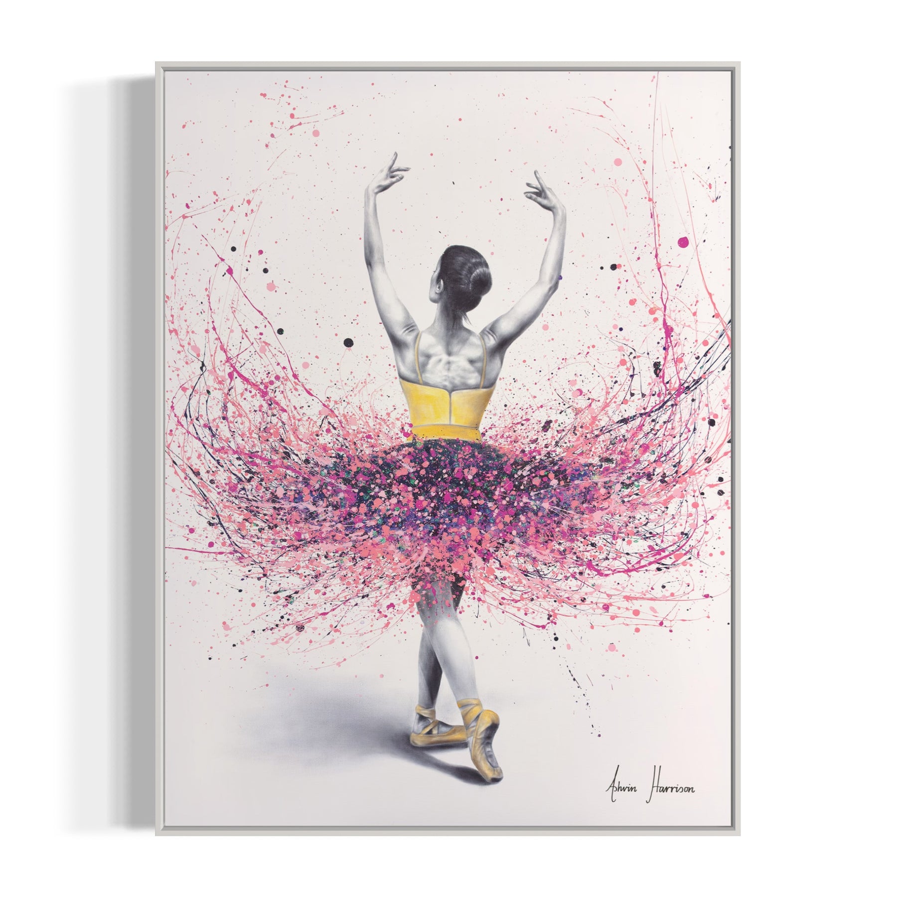 turning ballerina woman female figure in black and white wearing paint splatter acrylic tutu in pink and purple on white background