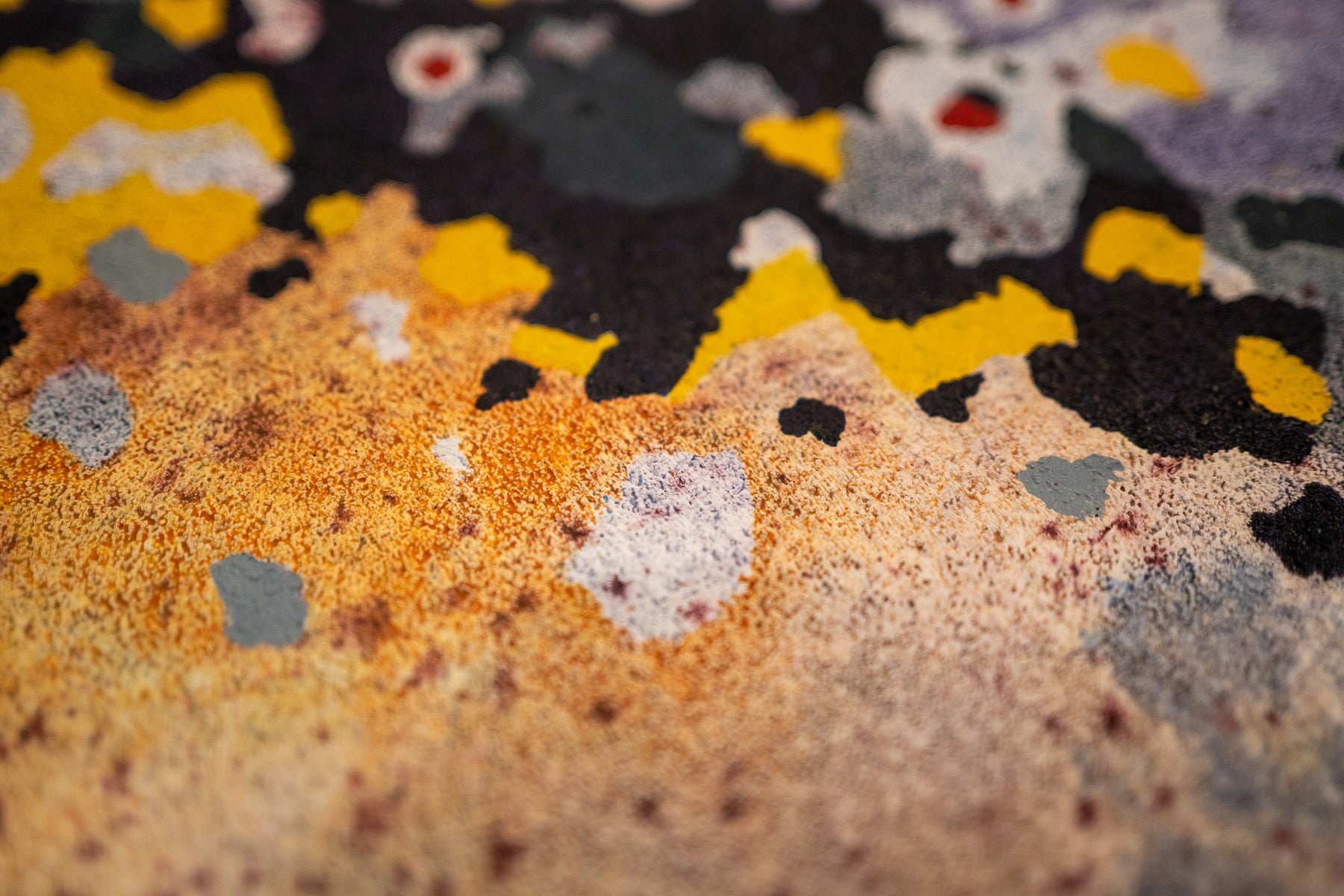 abstract expressionist splotches of blue green and yellow with red dots fish scale shiny textured pumice canvas