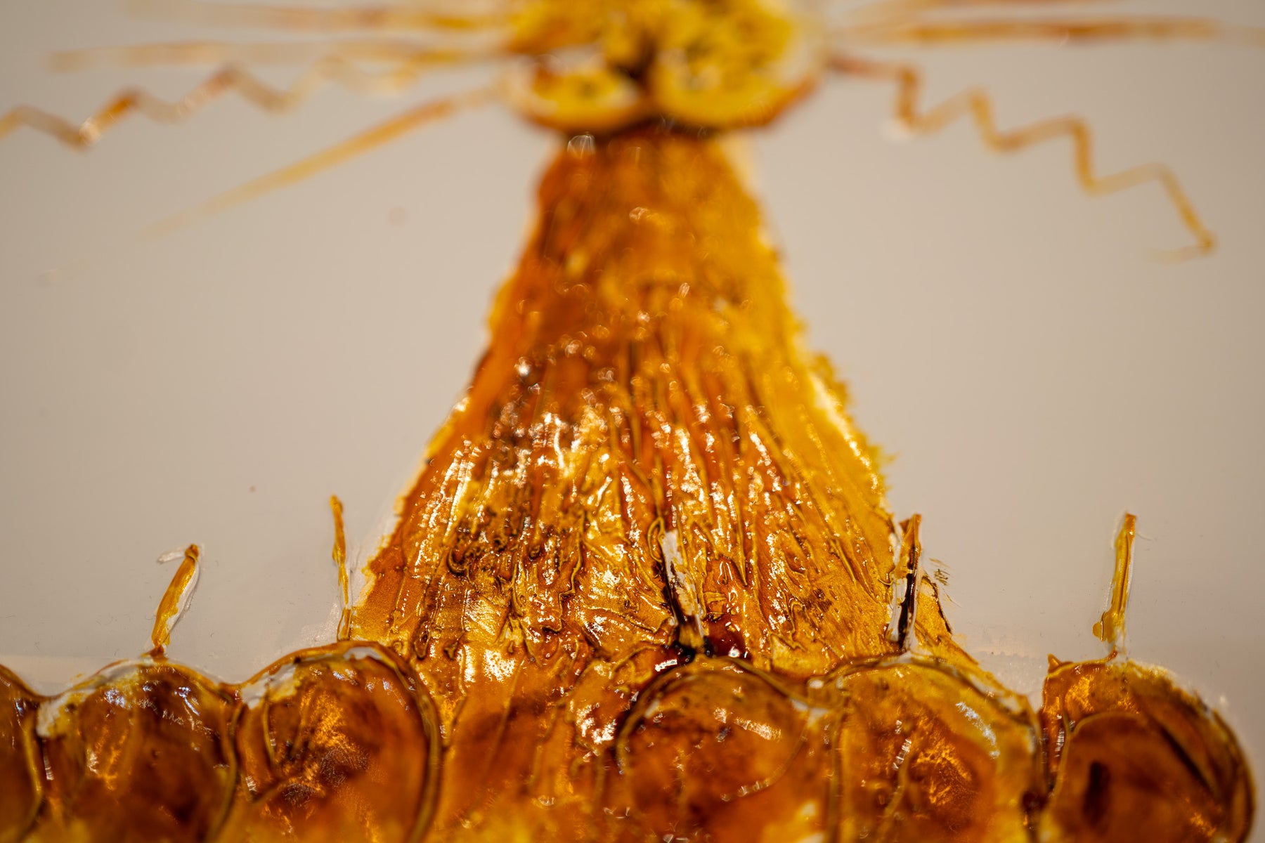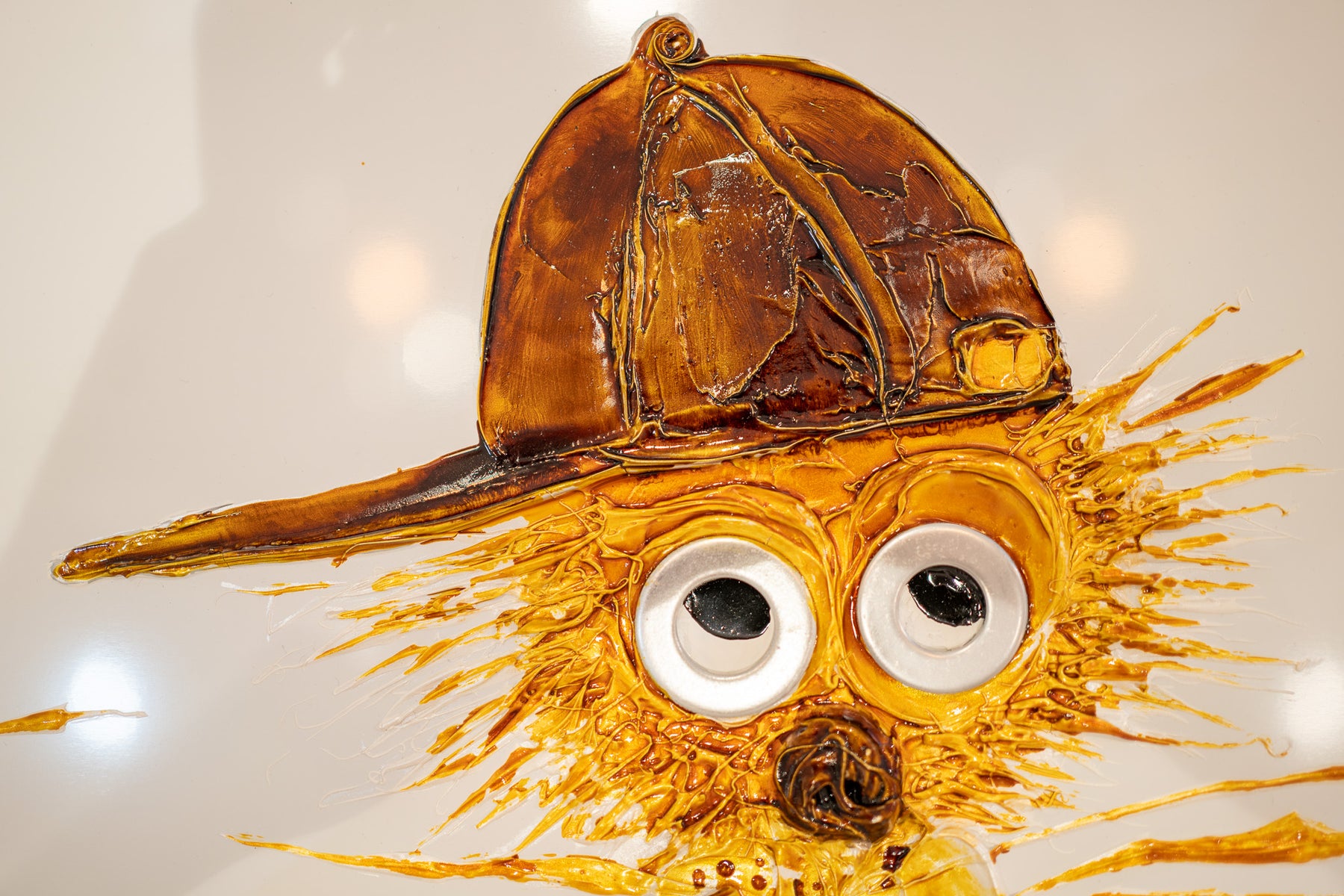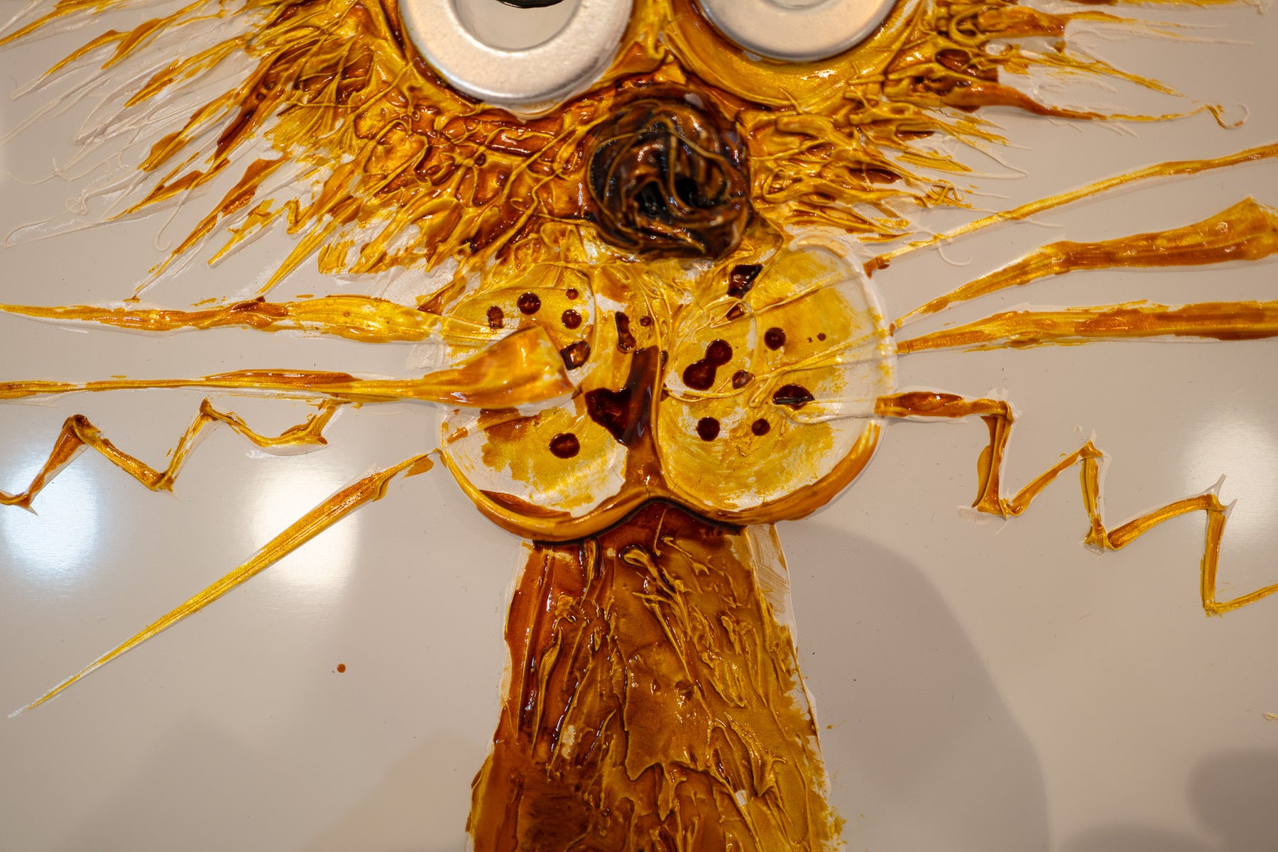 French graphic designer, illustrator, and painter Moogly creates semi-abstract "humanimal" portraits. His textured, splattered animals have oddly complex human expressions from bewilderment to apathy. Using acrylic, lacquer, and resin, he positions the monochromatic characters against a black void, allowing the eyes, marked by two machine washers, to speak. Moogly is deeply ashamed of the environmental harm caused by humans, so he allows animals to reflect this emotional damage back at us.