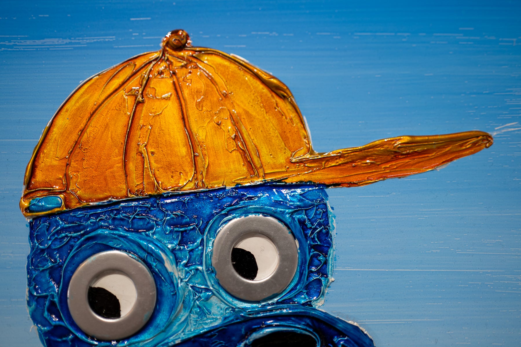 Acrylic 12" x 12" matted Sports Addict painting by Moogly. Navy and cobalt blue animated bird with washers as eyes, wearing an orange sideways baseball cap and looking to the left.