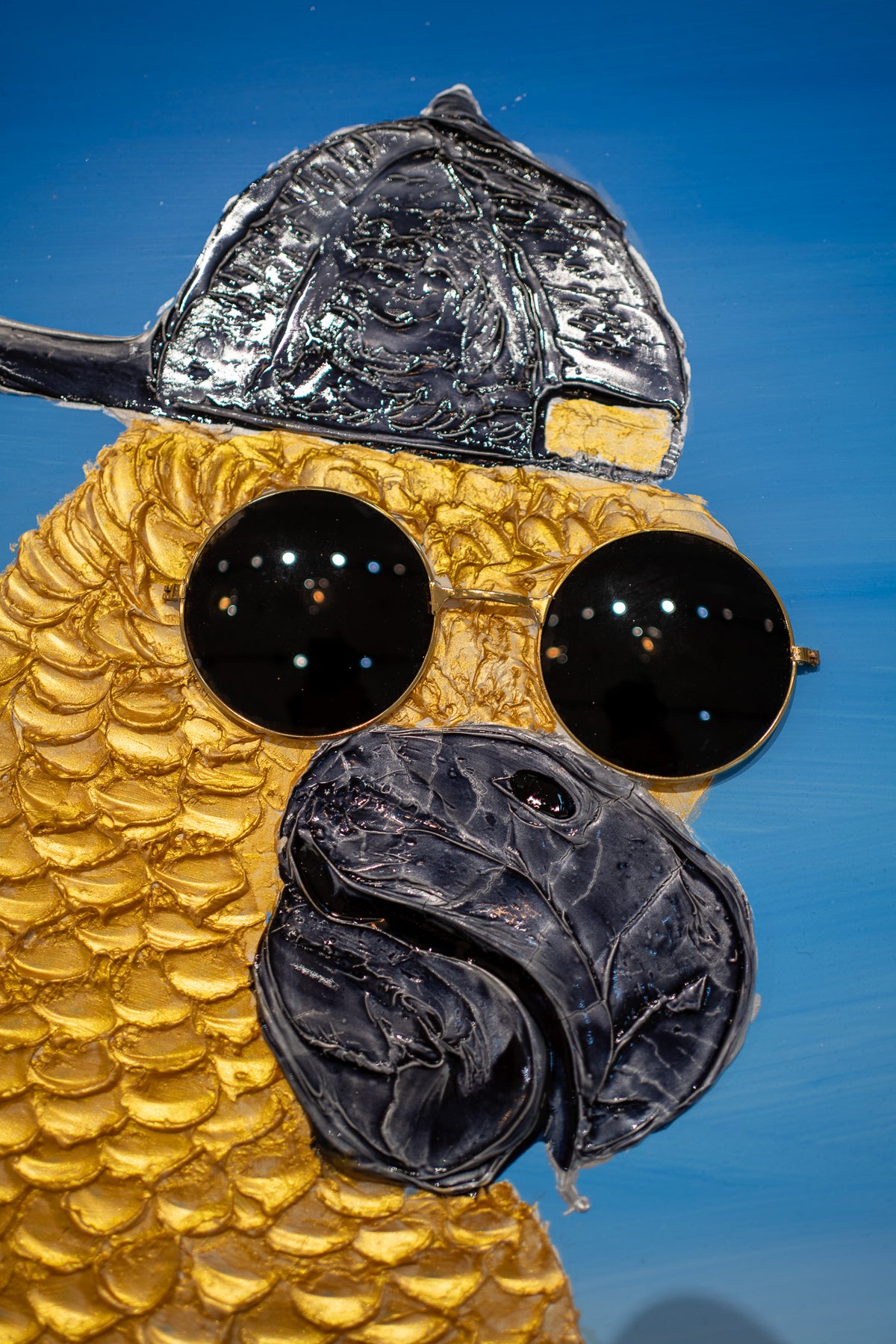 Acrylic 17" x 17" matted Success Story artwork by Moogly. Gold resin animate parrot wearing a backwards baseball cap and real sunglasses.