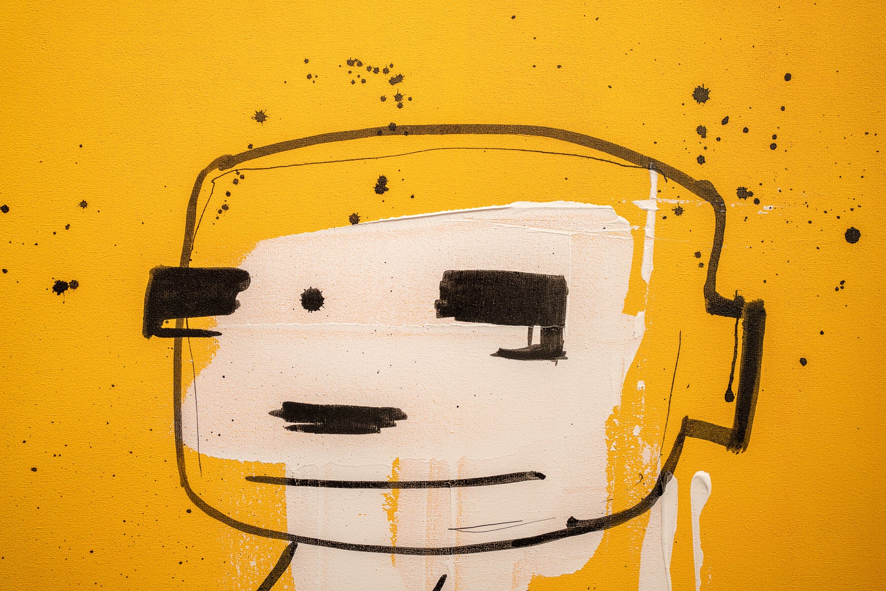 Concentrating on universally understood needs and emotions, Dutch artist Jan-Hein Arens is able to connect with every viewer and admirer of his works. Arens brings together humor and alienation through his paintings. The forefront is typically centered on a simplified figure and text that almost appears to be the thoughts of the figure. Often realistic drawings of body parts, common everyday objects or products are superimposed onto the foreground. Each piece is augmented with additional handwritten text detailing certain aspects of the piece in a comical tone. Paint splatters and rough brushstrokes fill out the remaining space in the paintings, allowing the figures and text to be the focus of each well-thought-out illustration.