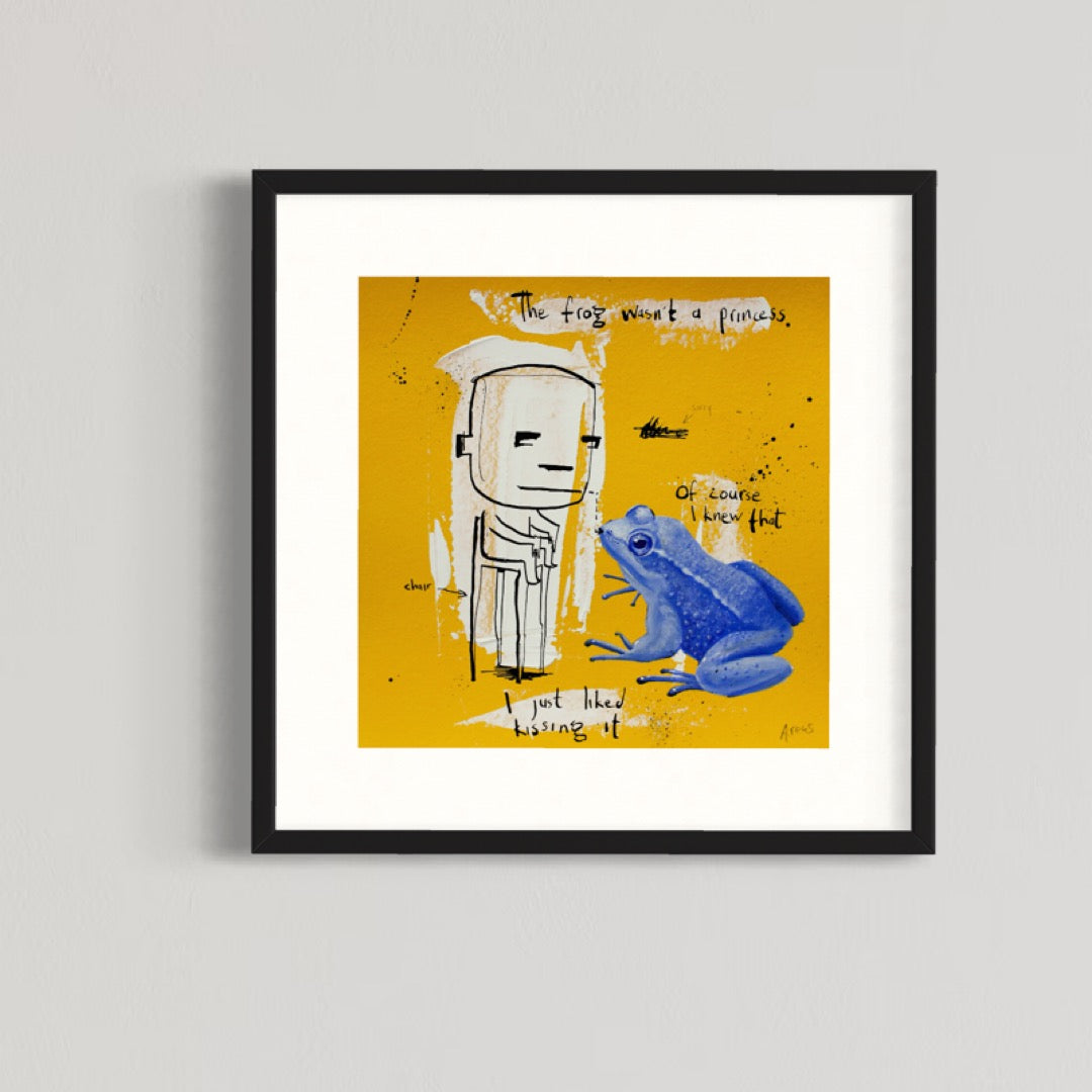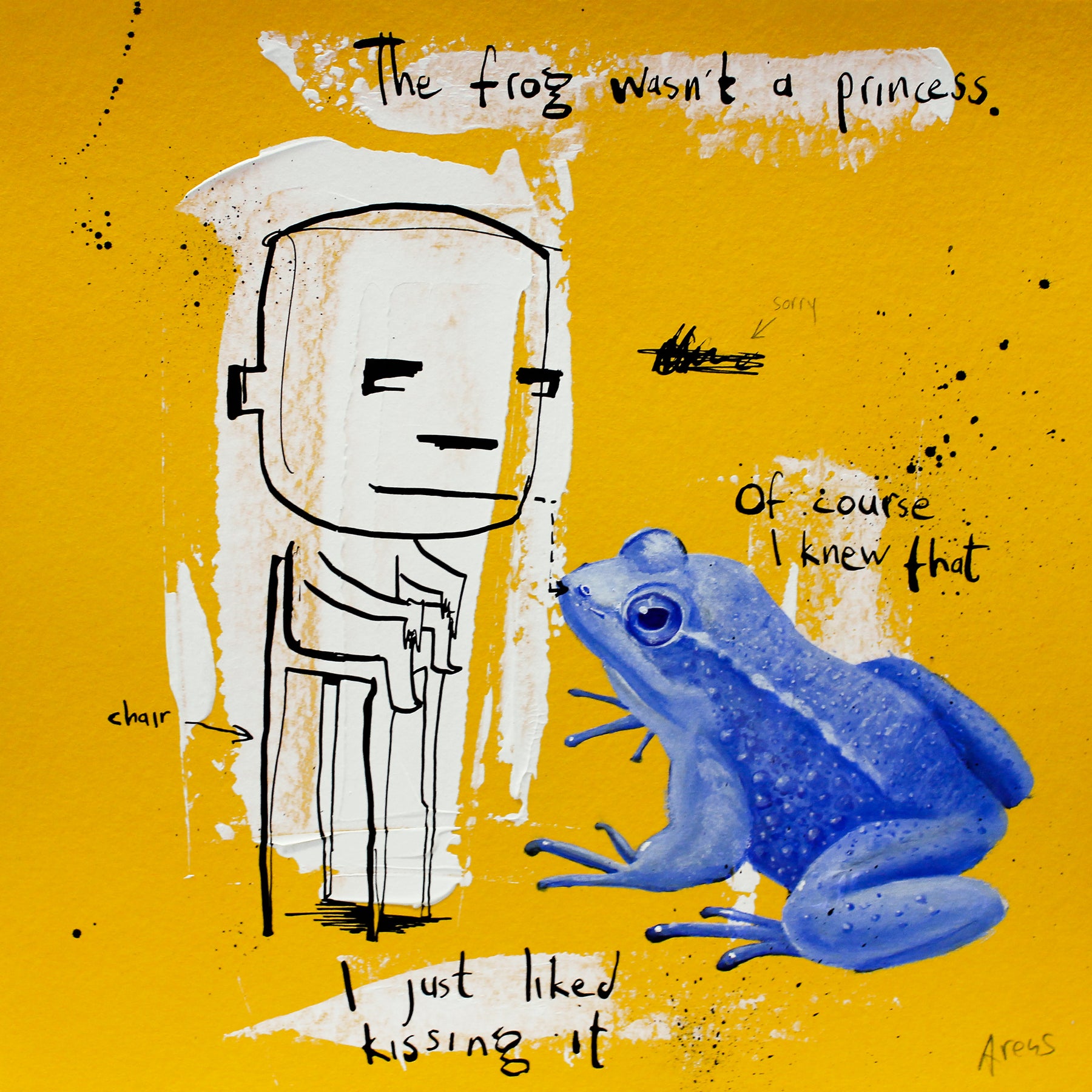 Concentrating on universally understood needs and emotions, Dutch artist Jan-Hein Arens is able to connect with every viewer and admirer of his works. Arens brings together humor and alienation through his paintings. The forefront is typically centered on a simplified figure and text that almost appears to be the thoughts of the figure. Often realistic drawings of body parts, common everyday objects or products are superimposed onto the foreground. Each piece is augmented with additional handwritten text detailing certain aspects of the piece in a comical tone. Paint splatters and rough brushstrokes fill out the remaining space in the paintings, allowing the figures and text to be the focus of each well-thought-out illustration.
