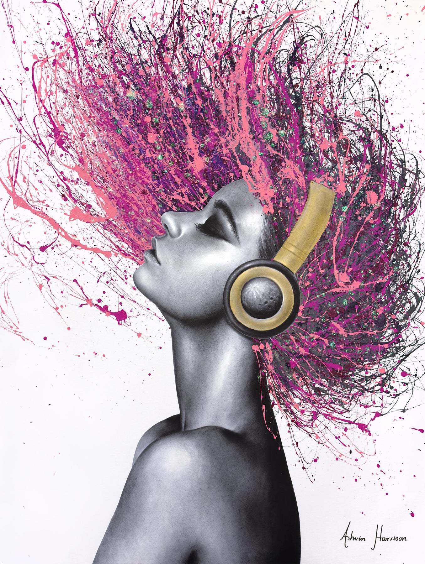 Working with charcoal dust powder, acrylic, and oil, Ashvin Harrison’s contemporary artistic style is so musical that his figures almost literally dance off the canvas. Harrison has come to be known worldwide for his integration of contrasting mediums. The painter begins with the soft, sultry subtlety of brushed charcoal to create sensual, hyper-realistic figures with digital-like precision in black and white -- dancers, hummingbirds, planets, trees, and musical instruments to name the most iconic. From there, Ashvin splatters and paints this initial charcoal with many layers of color, creating a mystical chorus of beauty, sensation, and light.