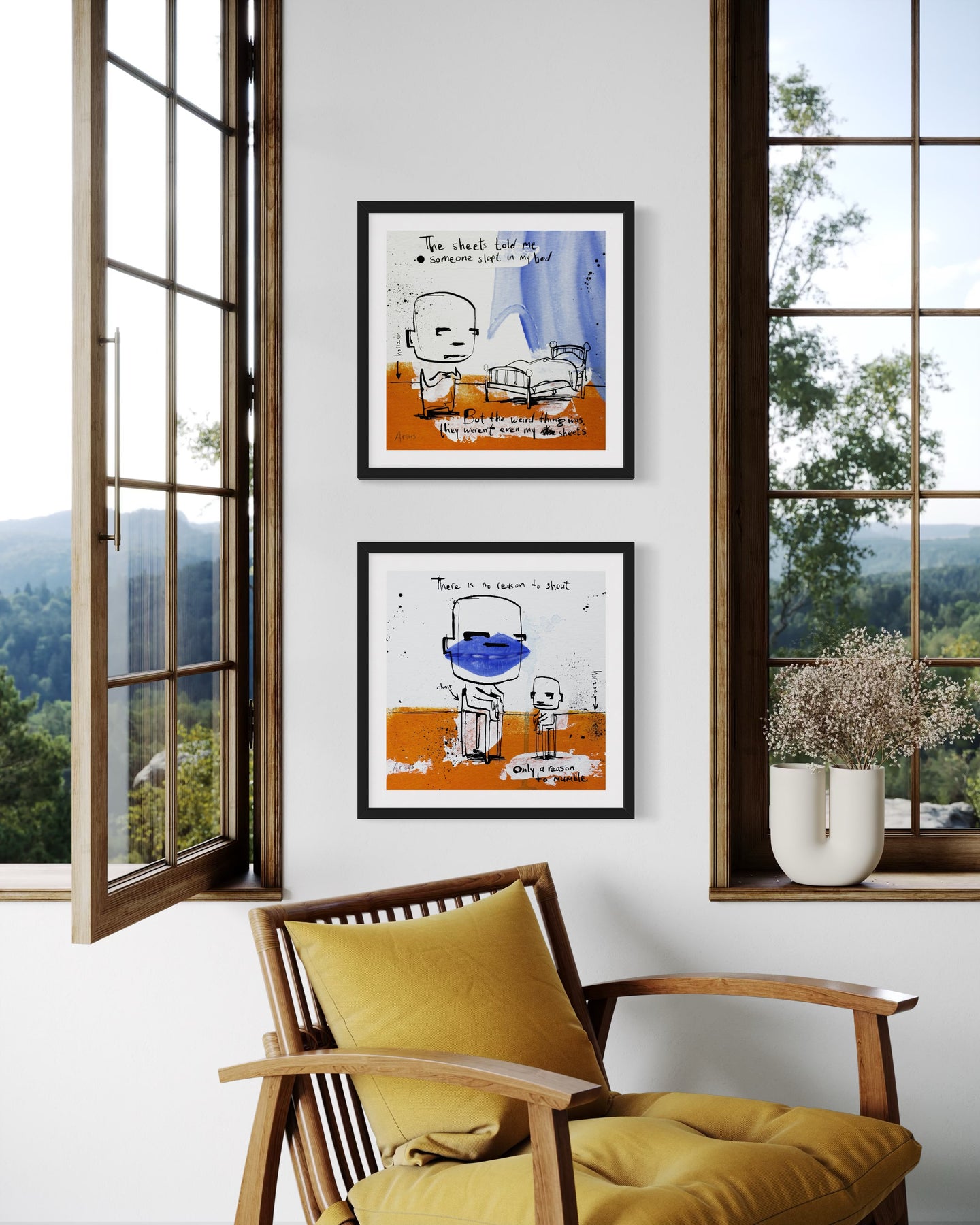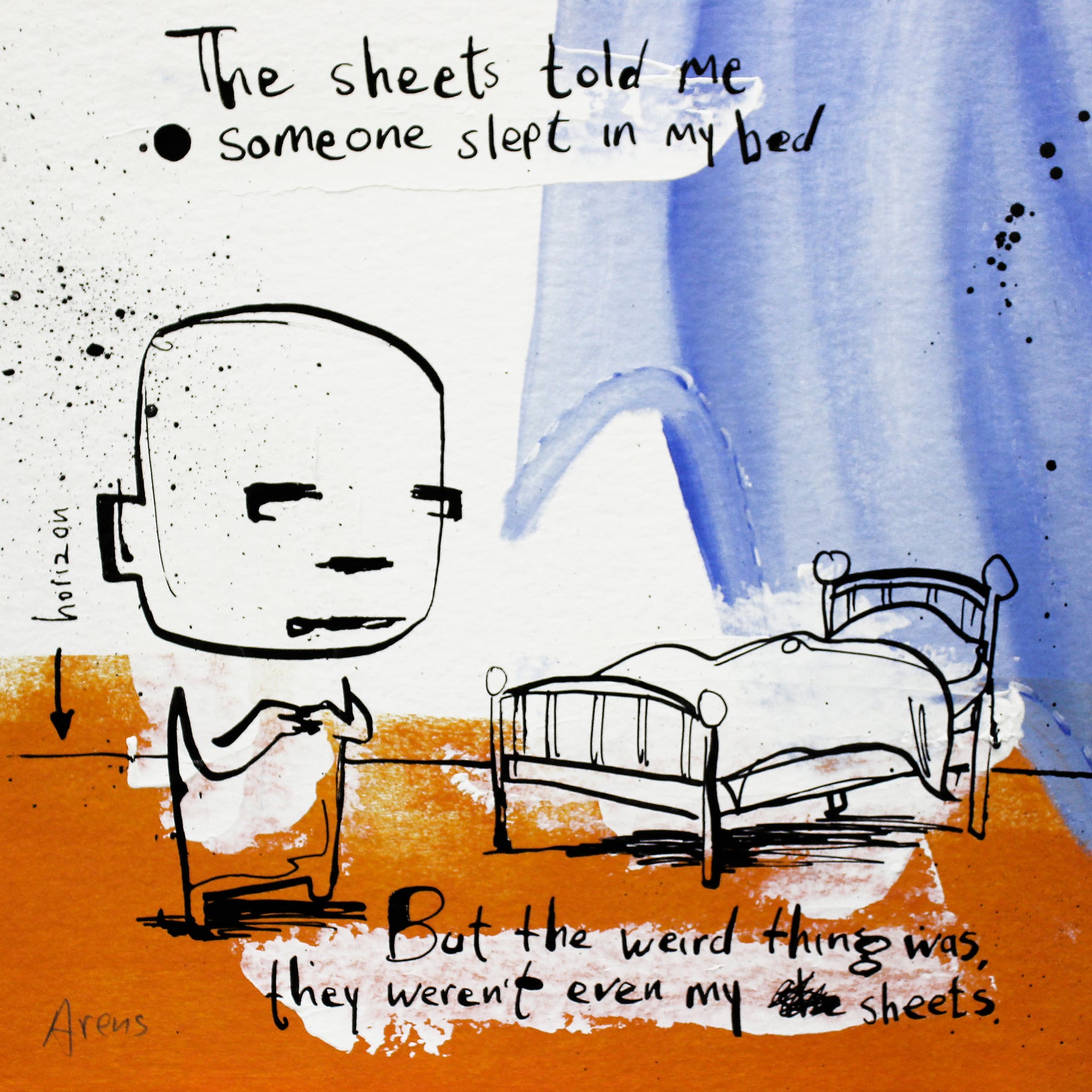 doodle figure in ink with bed drawing, orange acrylic ground and blue fabric in background on white back, text humor satire jan hein arens