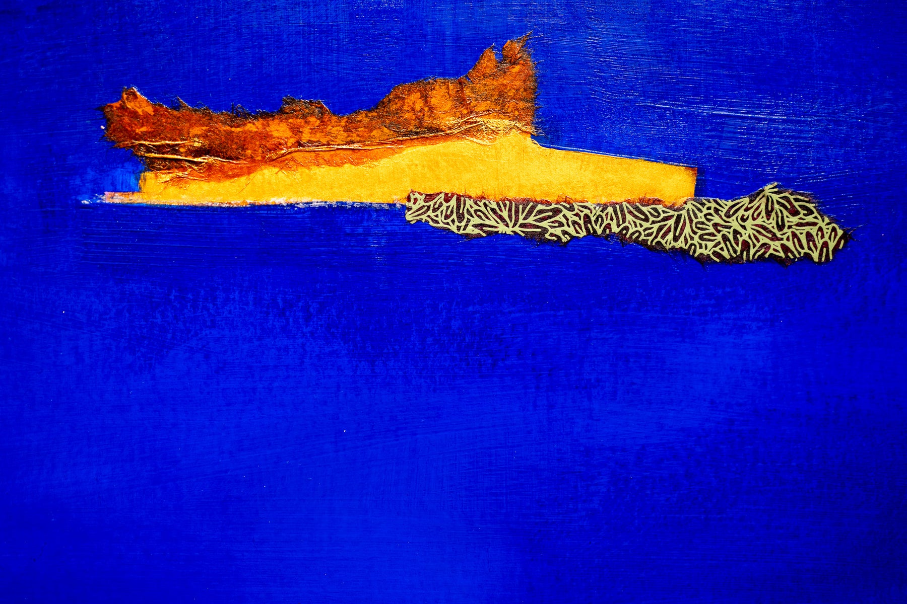 royal blue painting with abstract cut paper fabric and painted shapes  collaged at bottom with gold foil