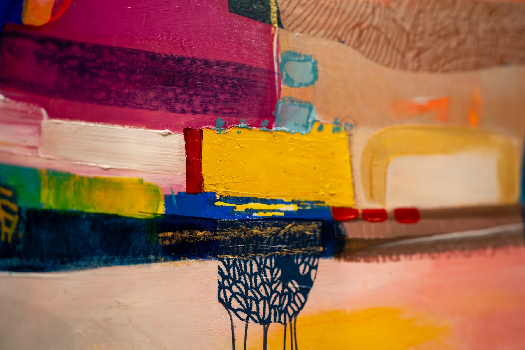 Growing up near the banks of the Loire river in France, abstract expressionist painter Lau Blou fell in love with the warm colors and softness of her natural surroundings. Her abstract paintings hint at landscapes, textured with paper and fabrics, gold and silver leaf, acrylic, and glazes. In her works, Lau Blou finds a masterful balance between chaos and negative space.